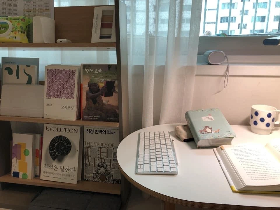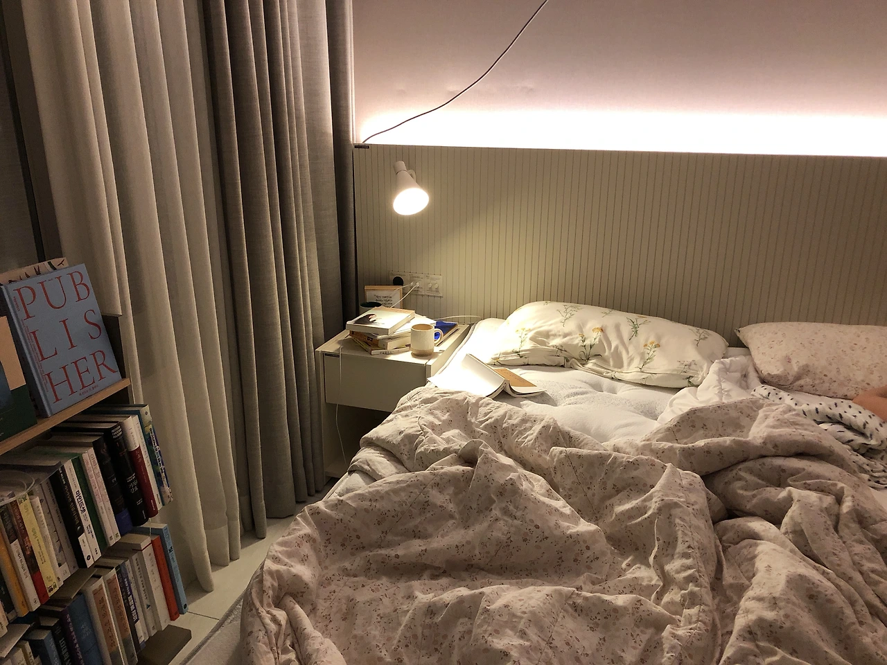 침구를 놓고, 북선반을 옆에 들이니 그럭저럭 운치가 있다 :) 은은하게 불을 밝히고 있으니 잠을 자기도, 이 불빛을 두고 출근하는 것도 아쉬워진다. (덕분에 침대에서 좀더 뒹굴다가 출발 시간이 조금 늦춰지기도 했다는)