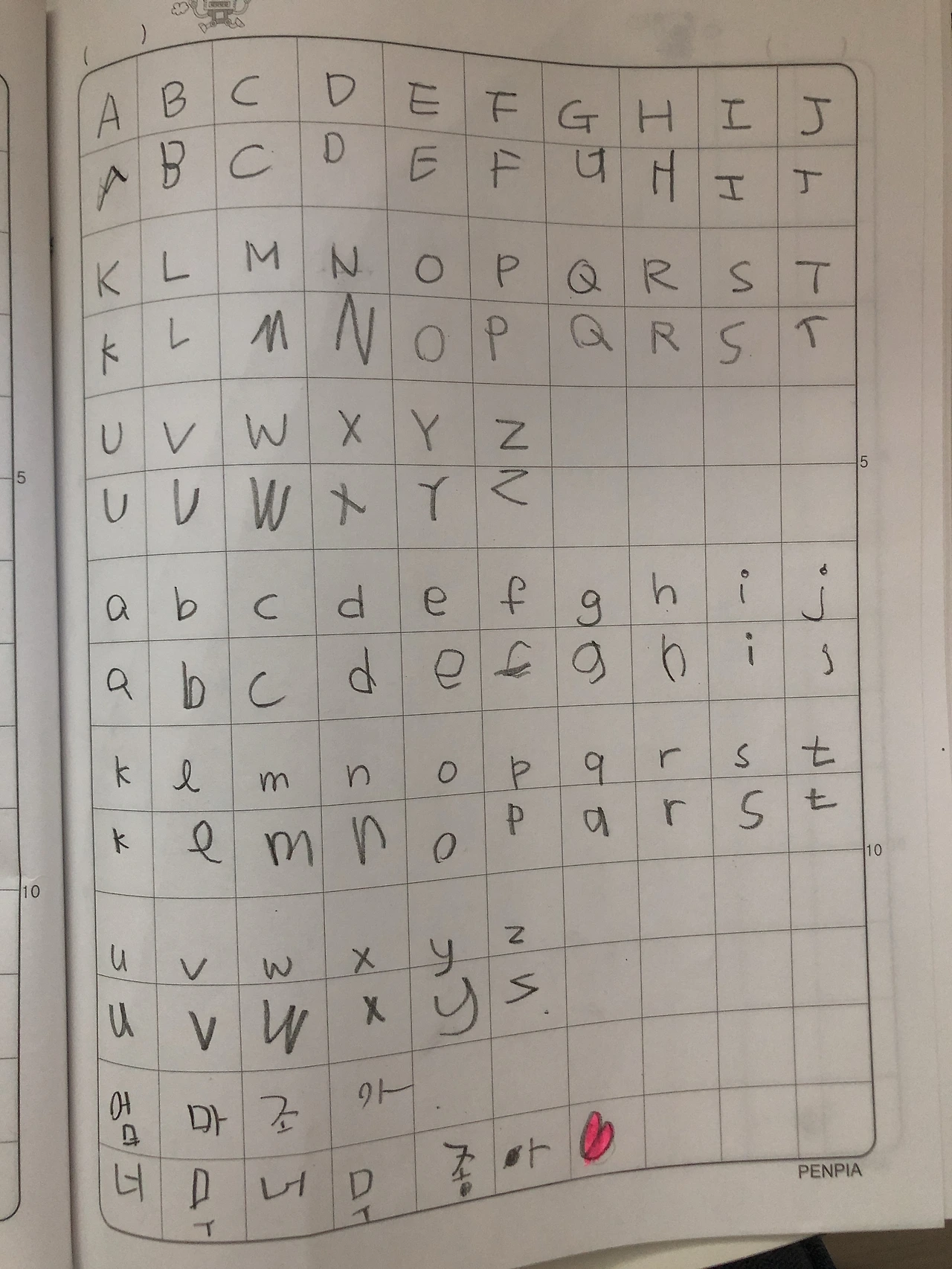 요것은 얼마 전에 알파벳 익혀보자고 ABC 써놨는데 맨 마지막 두 줄 빈칸에 또 사랑고백 써놔서 엄마 심쿵. 딸은 늘 사랑한다는 말만 들려줬었는데, 엄마가 좋았다 미웠다 하는 너는 참. 어쩜 그리 자기 감정에 충실한 거니.