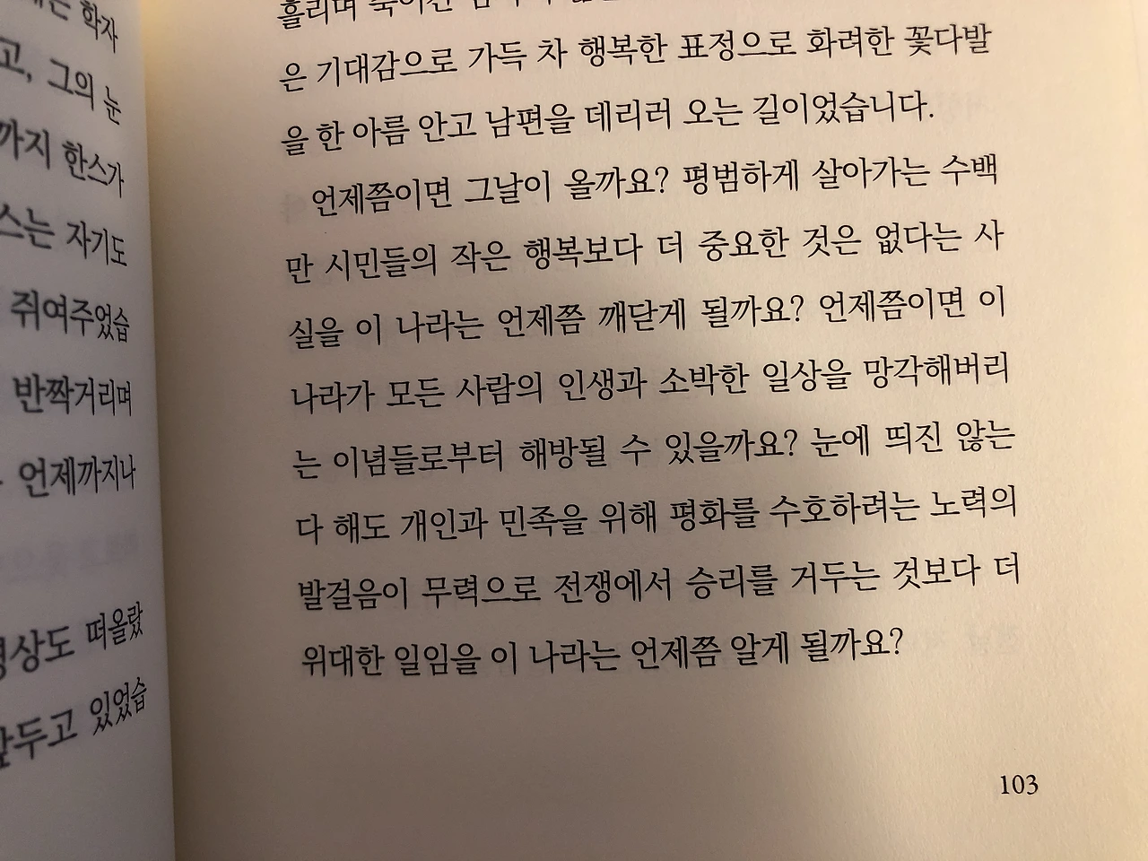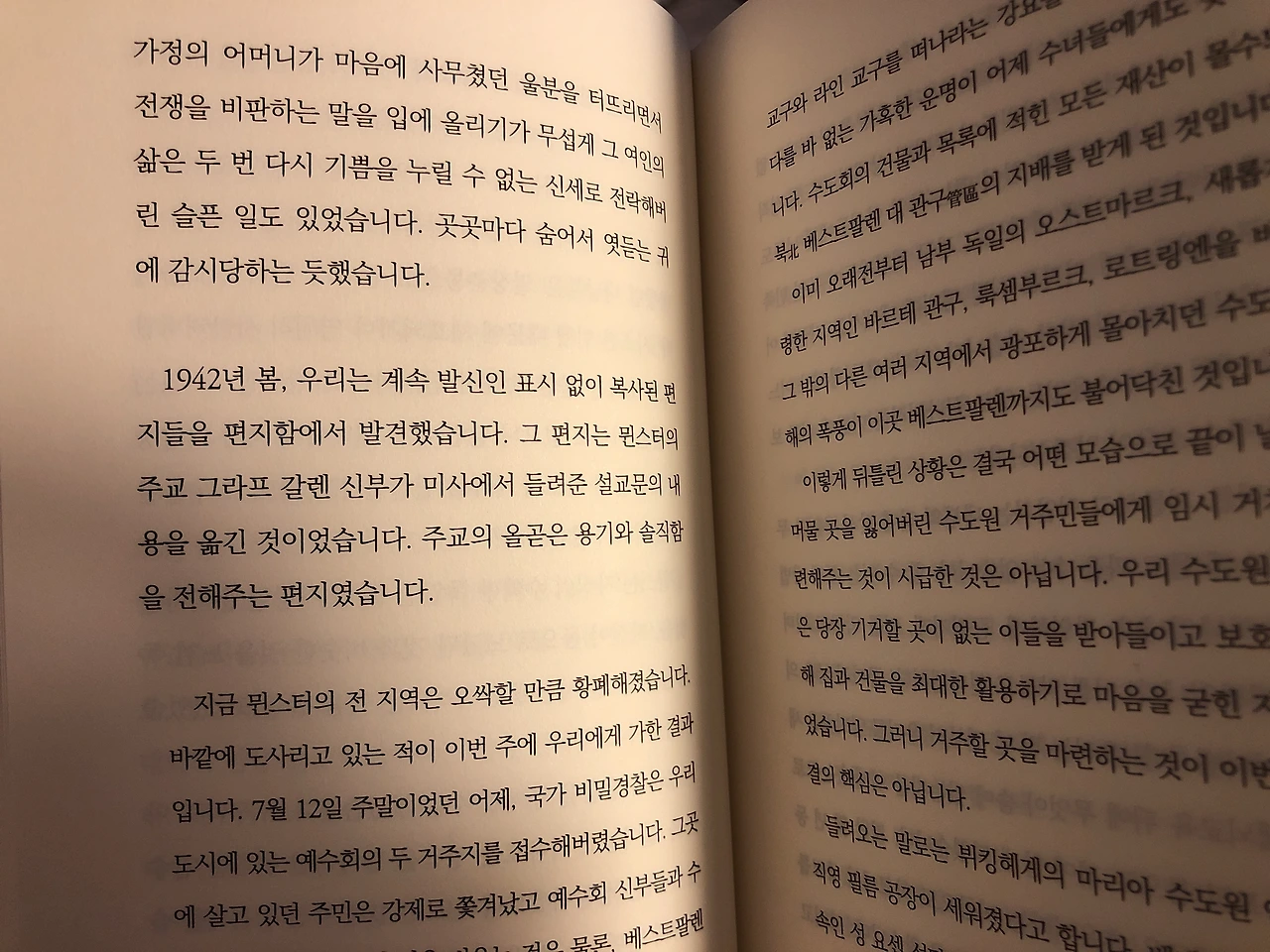 무거운 내용이지만 서정적이고 쉬운 문체로 쓰여 책장이 스르륵 넘어간다. 원래도 역사에 관심이 많고, 나치 시대에 항거했던 디트리히 본회퍼 목사의 책을 읽으면서 이 시대에 대해, 그리고 이런 폭압의 상황에서 인간은 어때야 하는지를 배우고 싶어 이런저런 책들을 읽어왔다. 그러던 중 예기치 못하게 직, 간접적으로 겪어야 했던 일들이 있었고 그러면서 새삼 많은 이들이 겪고 있는 고통의 문제와, 개인과 사회는 여기에 어떻게 대응해야 하는지에 대한 고민이 깊어졌다.