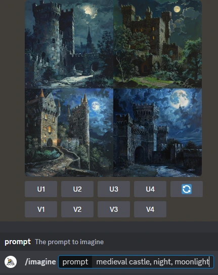 설명 : 중세 시대의 성을 밤에 달빛 아래에서 묘사하는 이미지를 생성합니다.