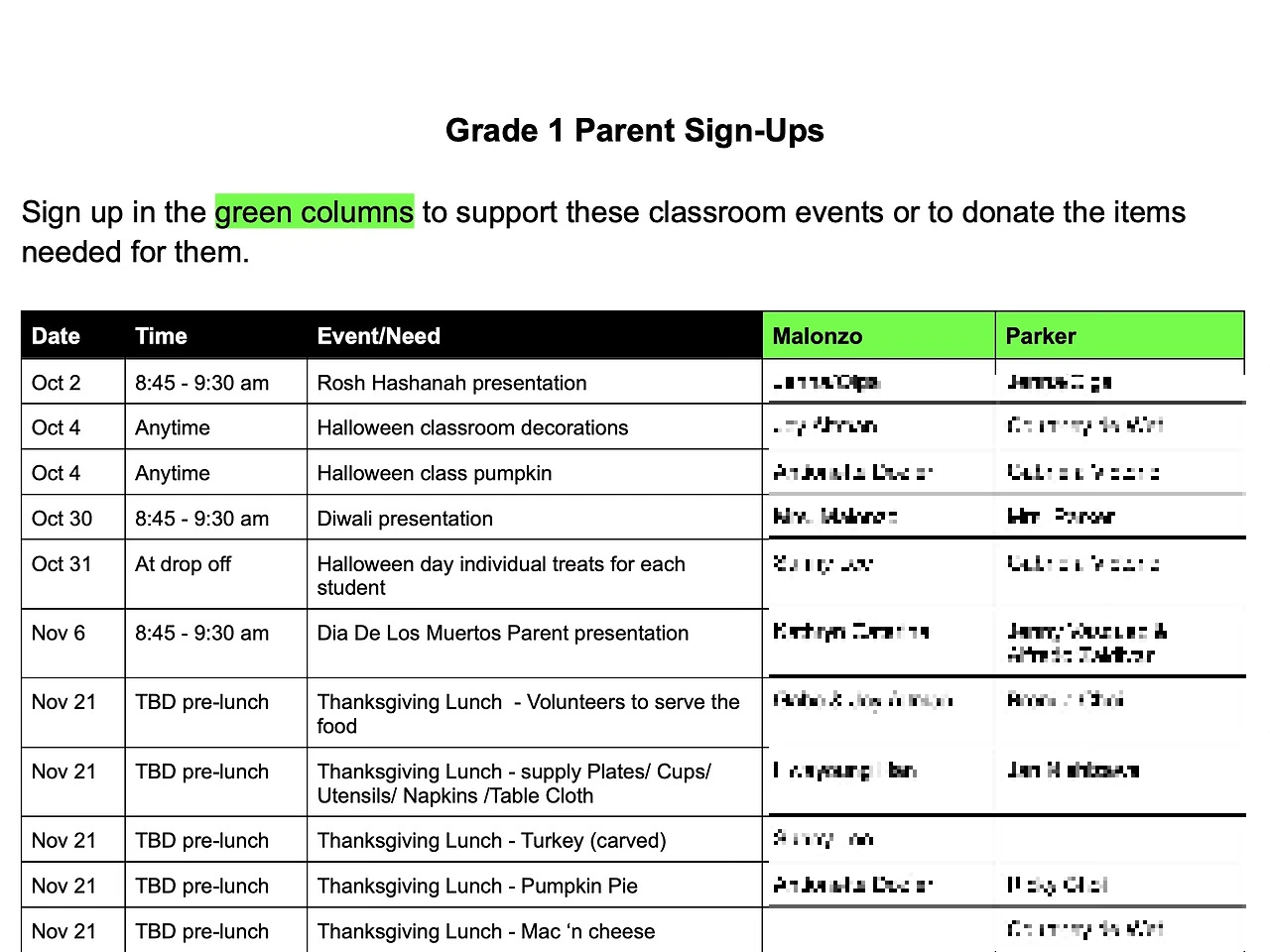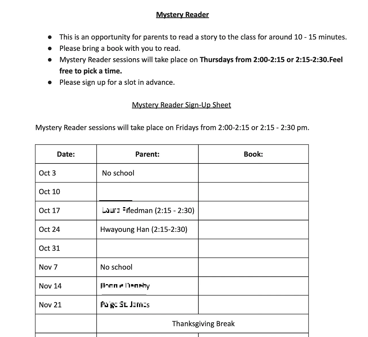 동시에 <연간 volunteer 캘린더>가 배포됐는데 향후 1년간 있을 행사에 필요한 volunteer를 미리 자원받는 거다. 할로윈과 크리스마스 데코레이션, 땡스기빙 런치 준비, 특정 인종이나 종교 관련 기념일에 대한 프레젠테이션, 미스터리 리더(Mystery reader) 등 그 종류도 다양한지 모른다. 학년마다 별도로 진행되기 때문에 나는 두 개의 캘린더를 받았고, 여태 뭘 얼마나 해야 하나 째려보는 중이다.