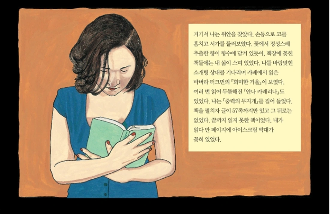 꽃에서 정성스레 추출한 향이 향수에 담겨 있듯이, 책장에 꽂힌 책들에는 내 삶이 스며 있었다. 나를 바람맞힌 소개팅 상대를 기다리며 카페에서 읽은 바버라 터크먼의 『희미한 거울』이 보였다. 여러 번 읽어 두툼해진 『안나 카레니나』도 있었다. 나는 『중력의 무지개』를 집어 들었다. 책을 펼치자 글이 57쪽까지만 있었고 그 뒤로는 없었다. 끝까지 읽지 못한 책이었다.