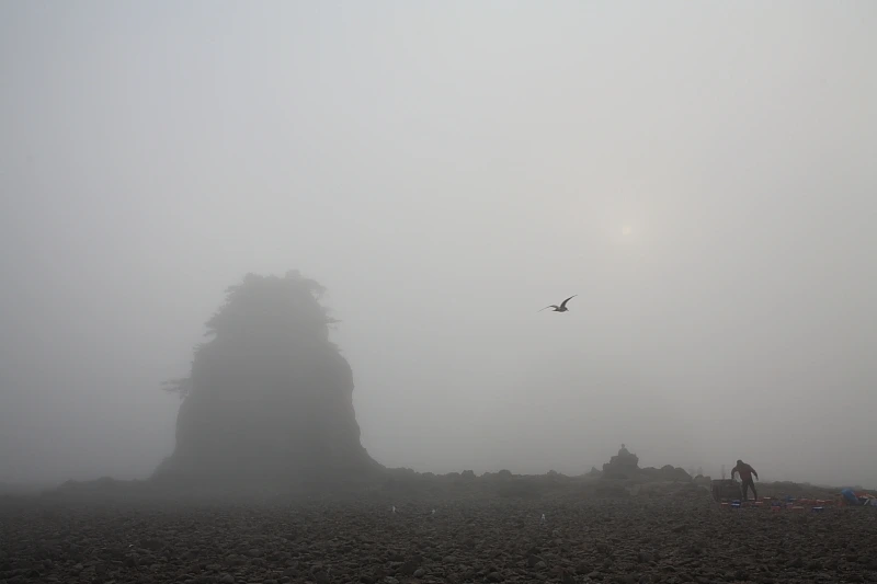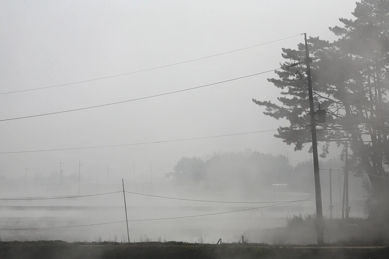 해무가 없는 곳을 찾아 내려가는 것이었는데, 이상하게 내려가는 길 풍경에도 해무가 조금씩 끼기 시작했다. 알고보니 해무는 우리가 움직이는 방향과 같이 이동하고 있었다. 마음이 조급했지만 차는 그다지 쌩쌩 달릴 상황이 아니었고 바람을 탄 안개는 우리를 앞질러 내려갔다.