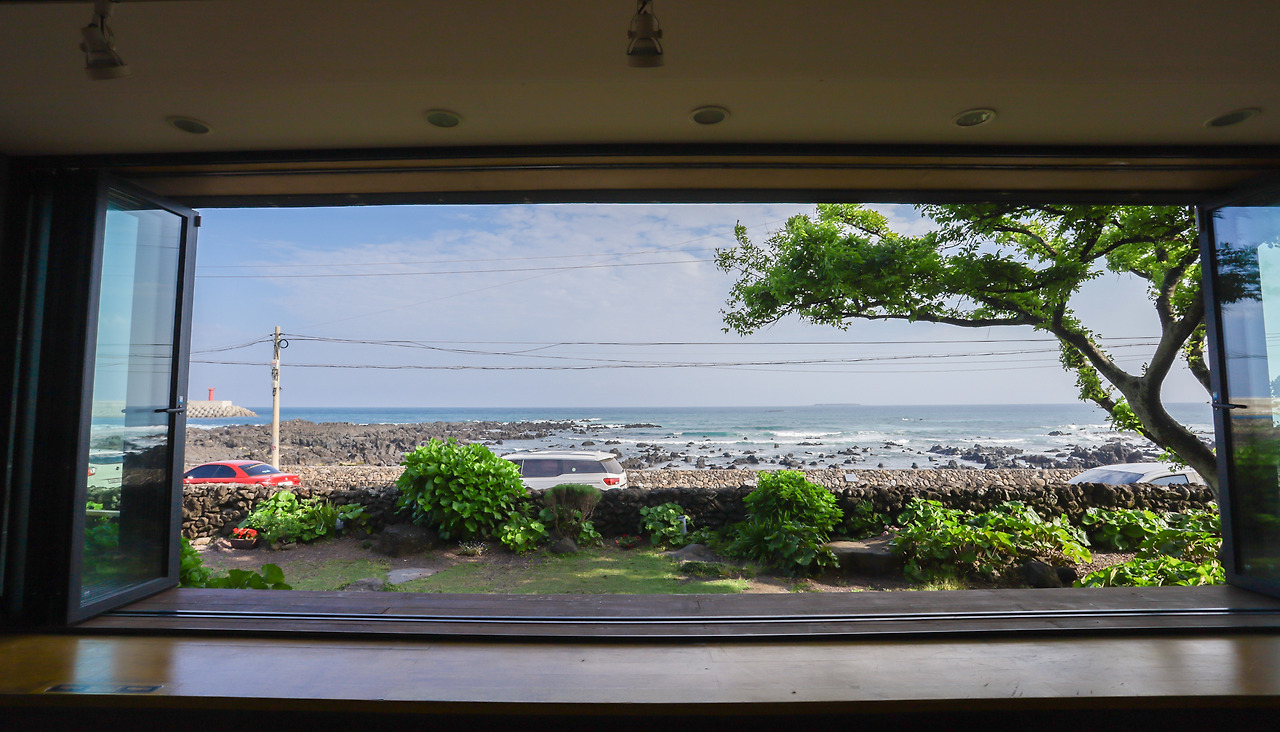 나는 남원읍에 있는 카페 서연의 집을 좋아한다. 처음에는 영화 「건축학개론」의 추억 때문에 찾은 것이 사실이다. 그러나 이곳에서 내다보이는 풍경과 얼굴을 스쳐지나는 바람은 소박한 제주를 느끼게 해 준다. 정말 해가 떨어질 때까지 앉아있다 가고 싶다. 그러나 현실은 지겨워하는 아이들의 성화를 견뎌야 한다. 30분 내 커피 한 잔 다 마신 후, 다음 코스 출발이다. 아쉬운 마음에 창가에 앉은 손님들께 양해를 구하고 사진 한 장을 담는다.