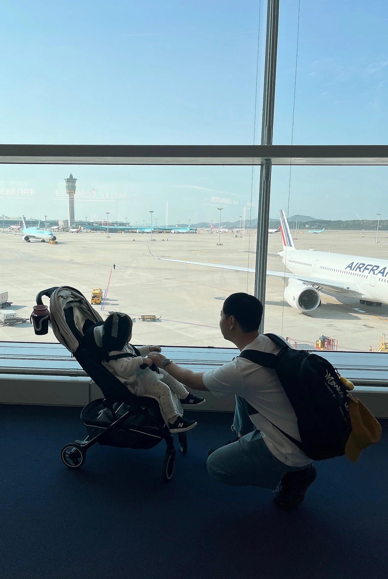 인천 공항 어딘가에 마련된 뽀로로 놀이터를 아이가 신나게 누볐다. 커다란 얼굴을 한 크롱에게 다가가 알은체를 하기도 했다. 후쿠오카 여행 때는 카운터에서 티켓 사진이나 기록용으로 급히 찍었는데, 이번에는 비행장을 배경으로 가족사진을 오붓하게 남겼다. 그만큼 마음이 한결 느슨해진 듯했다. 그래도 탑승 중에는 여전히 아기띠로 아이를 꼭 안고 있었다.