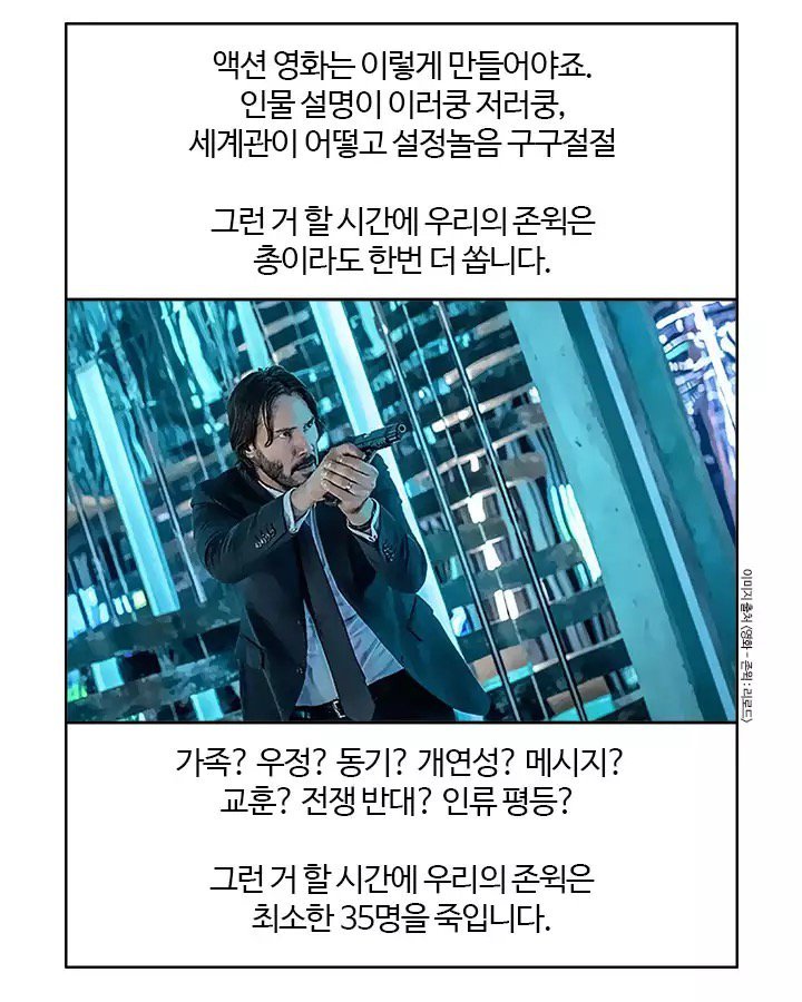 이 영화에 쏟아진 비난을 이해할 수 없었습니다. <존 윅>을 보면서 누가 서사를 찾습니까. 존 윅은 우리가 서사를 찾고 있는 동안 최소한 35명을 죽입니다. 정말 잘 만든 액션 영화는 서사의 약점을 충분히 덮고도 남으니까요. 물론 탄탄한 스토리가 받쳐주면 영화는 또 다른 경지에 이르지만 이 영화는 이미 서사가 필요 없습니다. 그래서 스토리 때문에 영화가 망했다는 사람들의 말을 믿을 수 없었습니다. 적어도 오락 영화로서라도 망하기 힘들다고 생각했거든요.
