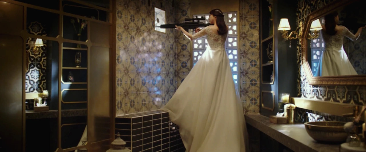 초반에서 한껏 기대치를 높인 영화는 한 시간 동안 로맨스 겸 신파를 찍습니다. 특히 대사의 품질은 최악입니다. 대사를 통해서 대충 상황설명을 하려는 게 너무 뻔히 보여요. 아니 그럴 거면 공감을 할 수 있도록 시간을 충분히 주던가, 영화의 강약이 전혀 조절이 안됩니다. 중간에 웨딩드레스를 입고 거대한 저격총을 환풍기 밖으로 겨누는 숙희의 씬은 아주 예술적으로 멋졌지만 그뿐이었어요. 아마 이 장면은 '예쁜 장면을 위해서' 억지로 끌고 간 설정일 겁니다.