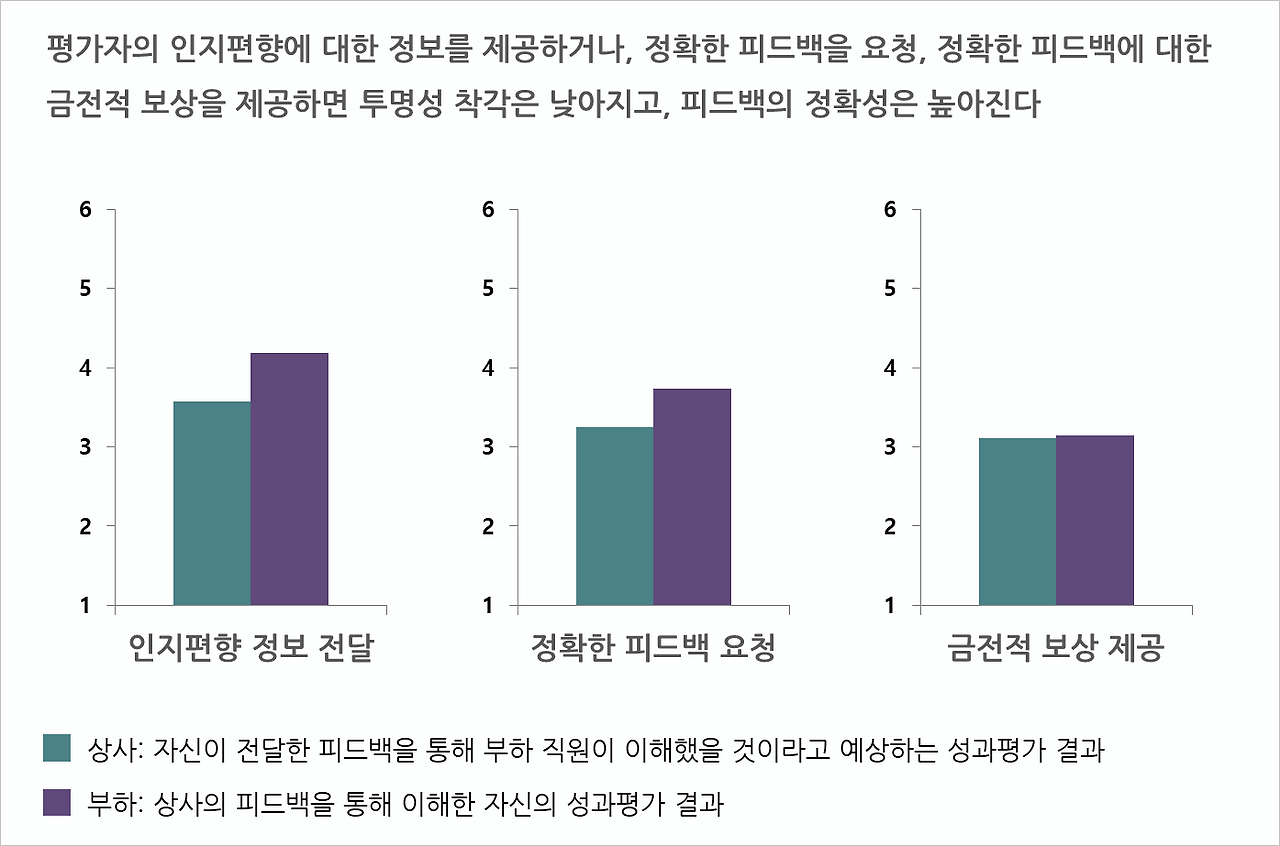 피드백이 제대로 전달된다는 것은 평가자의 편견으로 인해 피평가자의 수행을 왜곡되게 평가하지 않는 것이 선행되어야 하고, 동시에 객관적으로 평가한 내용을 투명성 지각과 같은 인지 편향 없이 정확하게 전달하는 것을 의미할 것이다.