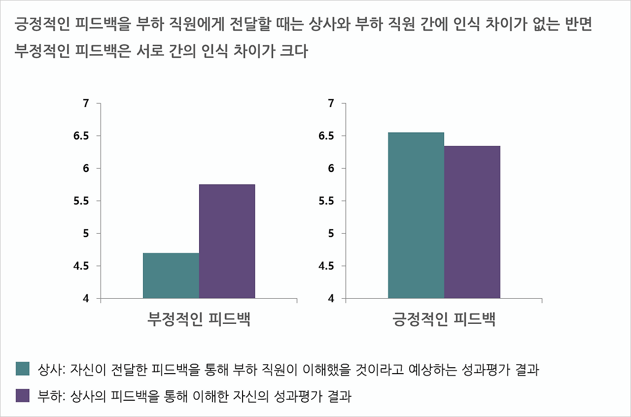 조사 결과, 긍정적인 피드백에 대해서는 상사와 부하 간에 큰 인식 차이가 발생하지 않았다. 그러나 부정적인 피드백은 상사의 예상과 부하가 이해한 것 간에 큰 차이가 나타났다. 다시 말하면, 상사는 부하 직원의 저조한 수행에 대해서 부정적인 내용 그대로 정확하게 전달했다고 인식한 반면, 부하 직원은 그다지 부정적인 피드백으로 받아들이지 않았다.