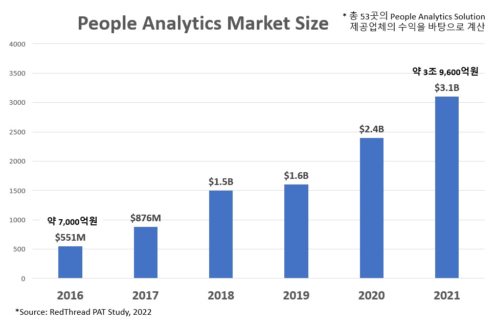 가장 먼저 눈 여겨 볼 것은 People Analytics의 시장 크기가 어떻게 변화해가고 있는가이다. 매년 People Analytics World conference에 참여하여 People Analytics Tech 시장의 변화 양상을 연구하고 있는 RedThread Research에 의하면 현재 People Analytics 시장의 크기는 약 31억 달러, 한화로 약 3조 9천6백억원에 이른다고 추정된다. 이는 기업에 People Analytics solution을 제공하는 vendor들의 수익을 바탕으로 계산한 것인데, 특히 지난 2년간 People Analytics 시장은 약 53% 성장한 것으로 나타났다. Covid-19 팬데믹에 의하여 다양한 기술적 활용이 HR에서도 일어나며, 자연스레 Data-driven HR 로의 변화 과정에 영향을 미친 것으로 보인다. 게다가 조사에 참여한 기업 중 97%가 올해 People Analytics 시장이 더 활성화될 것으로 봤으며, 그 중 절반 이상은 2022년에 약 30% 이상의 매출/수익 증대를 예상하고 있다고 하였다.