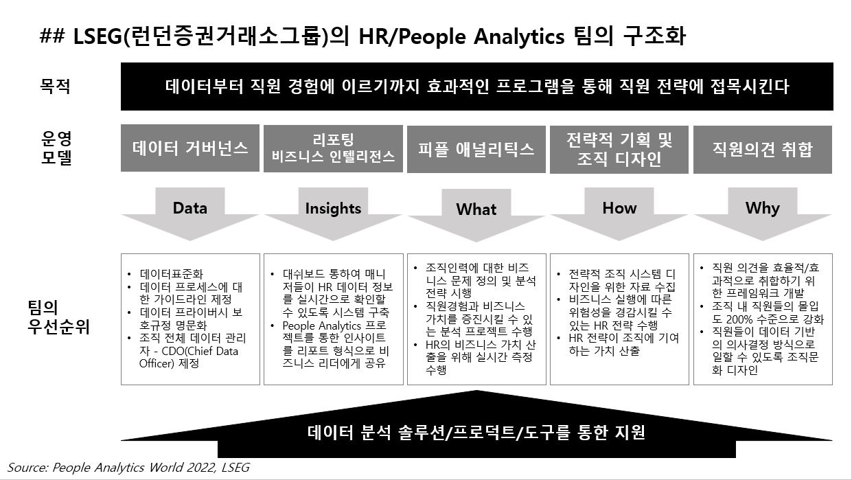People Analytics팀은 기업에서 어떤 역할을 하고 있을까? 점차 People Analytics 팀이 소수의 몇명이 아닌 팀 단위로 조직화 되면서, 컨퍼런스에서도 People Analytics 팀의 구성과 조직화에 대한 발표 내용을 자주 듣게 된다. 분석가가 1~2명일 때에는 HR 데이터 분석과 관련된 프로젝트를 내부 컨설팅 형식으로 수행하곤 한다. 그런데 이러한 인원수와 팀의 역할이 확장되면 어떤 구조상의 변화가 생길까? 일하는 방식이 어떻게 바뀔까? 기업 내에서 People Analytics팀이 어떤 구조로 기능하고 있는지를 이해하기 위해, Jordan Pettman의 발표 내용을 잠시 살펴본다. 그는 최근 네슬레에서 런던증권거래소그룹(London Stock Exchange Group, LSEG)로 이동하여 Head of Organisation Analytics and Insights를 맡고 있다. LSEG는 People Analytics와 연관된 업무 및 기능을 크게 5가지로 세분화하여 분할하고 있다. [그림2]에서 보다시피, 모든 부서는 궁극적으로 “데이터부터 직원 경험에 이르기까지 효과적인 프로그램을 통해 직원 전략에 접목시킨다”는 것을 목표로 두고 있다. 이 기치 아래 5가지의 서로 다른 하위 팀이 조직화되어 있고, 각 팀이 추구하는 우선순위는 각각 다르다. 각 모델을 통해 이뤄지는 활동은 통합적으로 조직 내 Data-driven 문화와 People Analytics의 활성화를 촉진한다.