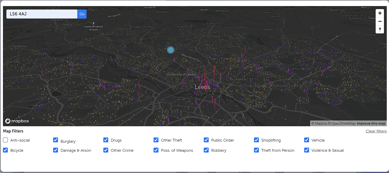 - 이 웹사이트에 이동하실 지역의 post code(우편번호)를 입력하면 해당 지역의 범죄 발생 빈도수/비율을 보여줍니다. 예를들어, 현재 제가 거주하고 있는 도시는 북잉글랜드에 있는 리즈(Leeds)라는 곳입니다. 저희 집이 있는 주소의 post code를 바탕으로 검색했을 때, 하단의 이미지와 같이 주변 모습이 나타납니다. 자세히 보시면 리즈(Leeds) 도시 센터 주변과 우측 지역, 남측 지역은 그래프 작대기가 높고, 제가 사는 지역 부근(푸른색 원)과 북쪽 지역은 그래프 작대기가 낮은 것을 알 수 있습니다. 여기서 그래프 작대기는 범죄발생 빈도수를 의미합니다. 즉, 리즈(Leeds) 지역은 중심가와 동쪽, 남쪽, 강(river) 이남의 서쪽이 상대적으로 우범지역임을 알 수 있습니다. 실제로 리즈 도시는 동쪽과 중심가는 외국인 이민자와 노동자들의 비율이 높고, 북쪽으로 갈수록 영국 로컬 주민들이 많습니다. 당연히 집 값도 북서쪽과 북쪽이 상대적으로 비싸고요.