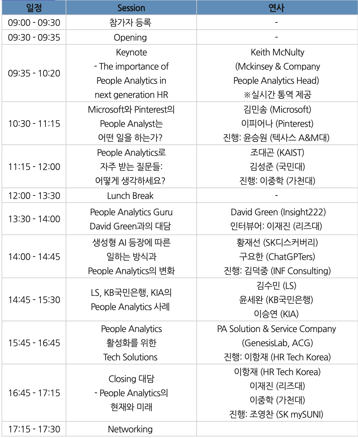 이 컨퍼런스가 한국의 피플(HR) 애널리틱스 분야 확장에 마중물이 되기를 바라는 마음입니다.