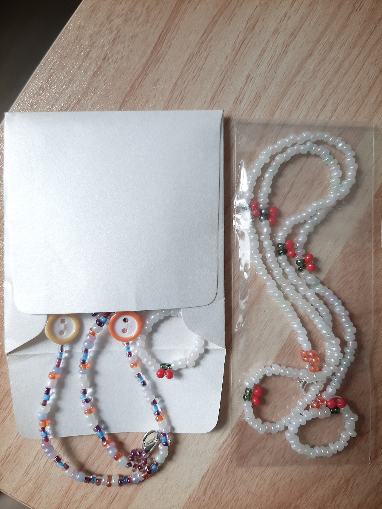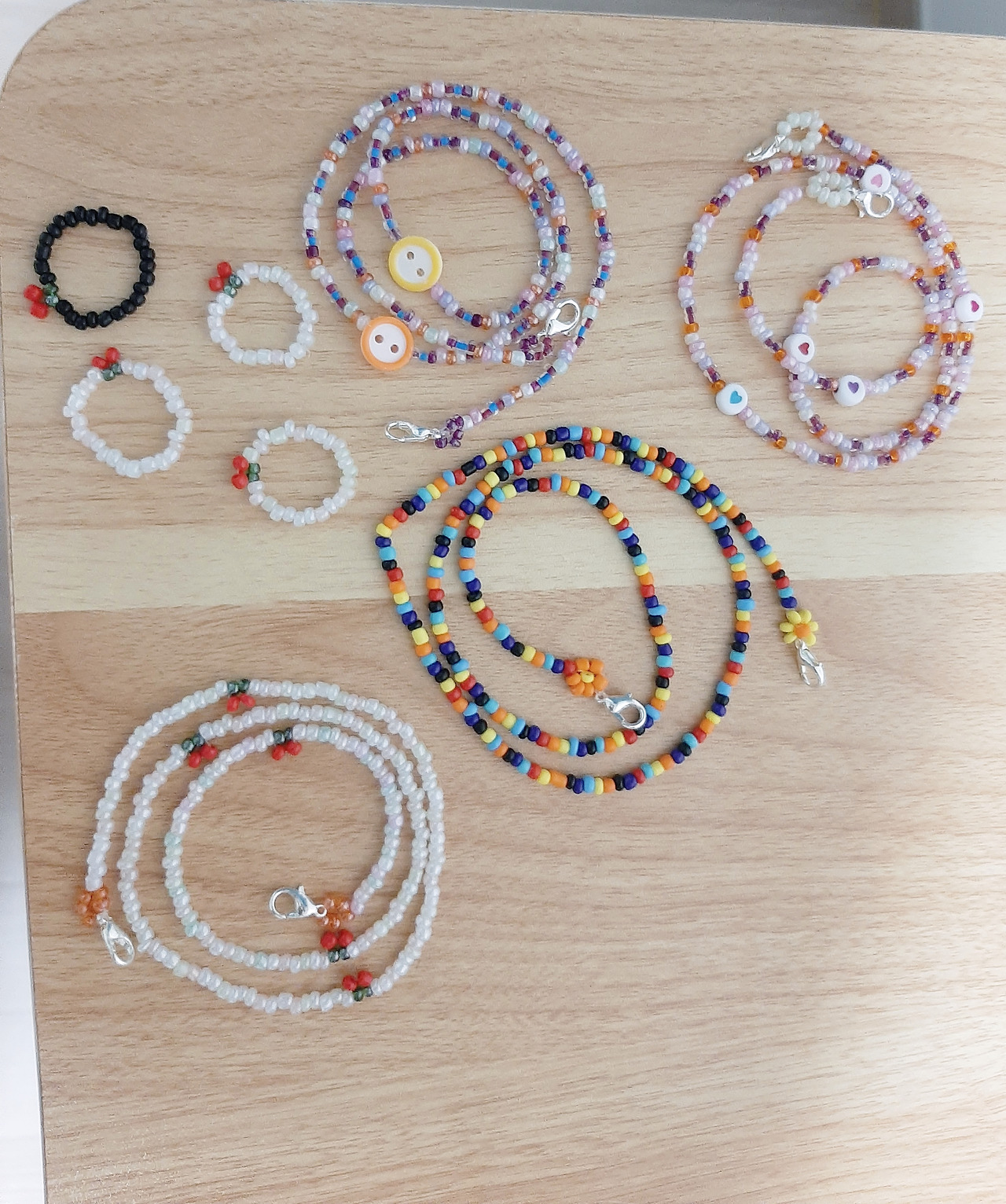 조카들을 위한 마스크 줄을 시작으로 팔찌, 반지를 만들어보았다. 만드는 법들을 먼저 글로 익히고 실전에 돌입하였다. 처음 몇 번은 마지막 마무리 작업 중 줄을 놓쳐 비즈가 다 바닥으로 쏟아져 첨부터 다시 만들기를 해야 했다. 그렇게 어렵게 완성해서 그런지 만들고 나니 뿌듯하기도 했고, 생각보다 예쁘기도 했다. 몇몇 지인들에게 만든 완성품을 보여주니 자신 들것도 만들어달라 해서 또 열심히 작업을 진행하였다.