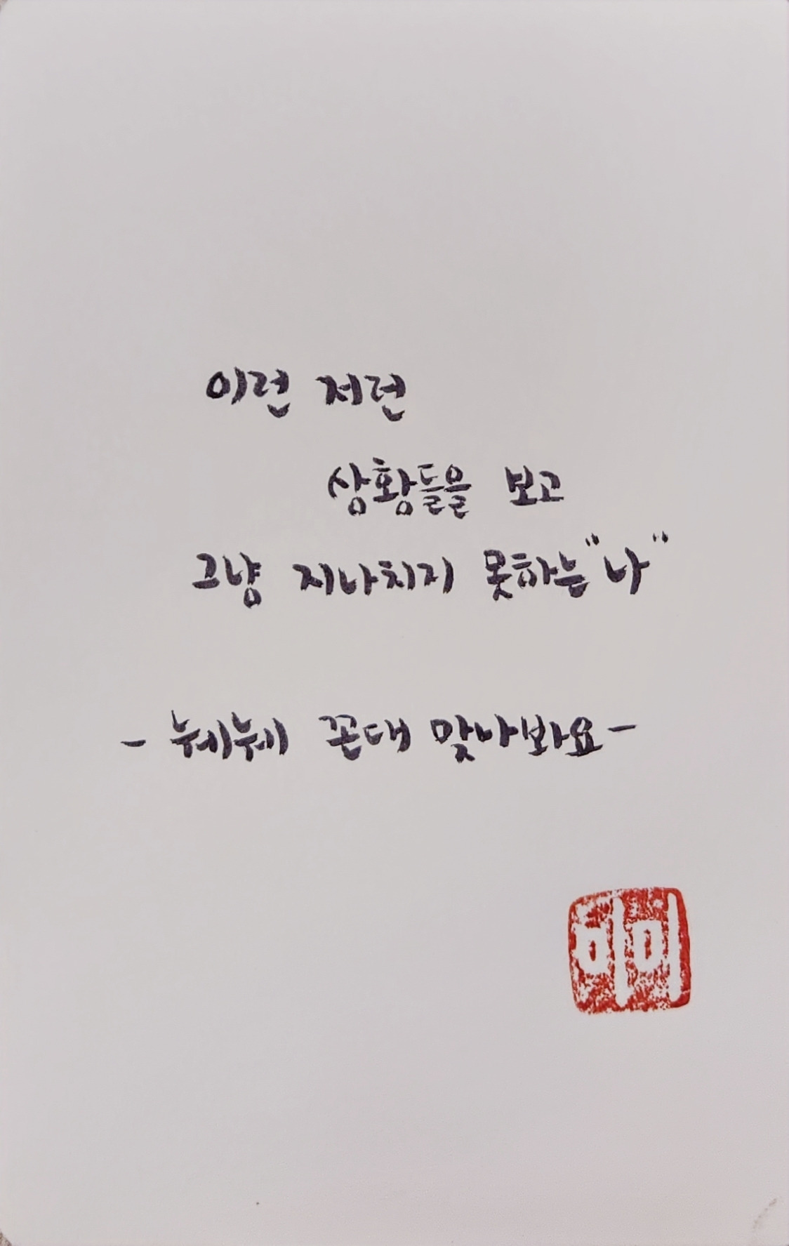 일상에서 가장 많은 시간들을 우리가 함께 보내는 곳이 직장이잖아요. 직장 내 일상 속 이런저런 상황들을 보고 그냥 지나치지 못하는 나는 꼰대일지 모르겠지만 그래도 저런 상황들을 그냥 지나친다면 그건 또 아닌 것 같아요. 그래서 저는 앞으로도 그냥 지니치진 못할 것 같아요. 훗날 생각이 바뀔진 몰라도 지금은 그게 맞는 것 같거든요.