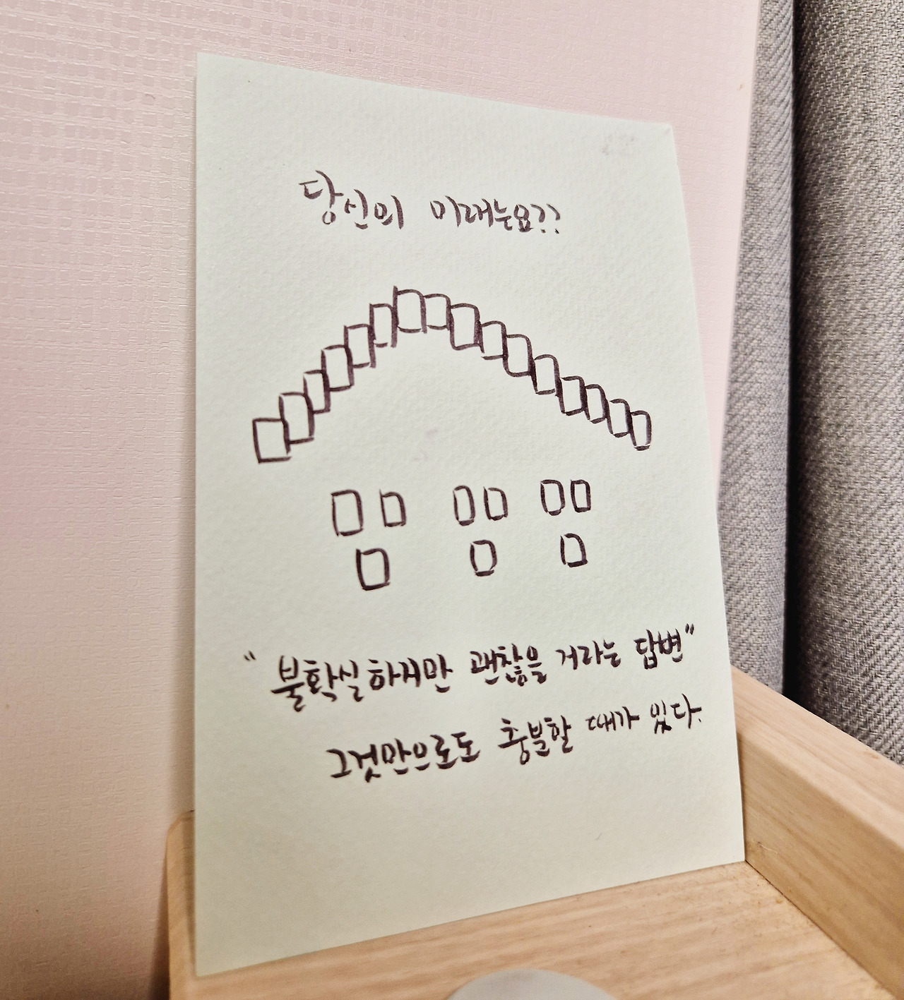 미래는 말이죠. 물론 하기 나름이라는 거 알지만요. 때로는'불확실하지만 괜찮을 거라는 답변' 그것만으로도 충분할 때가 있어요.