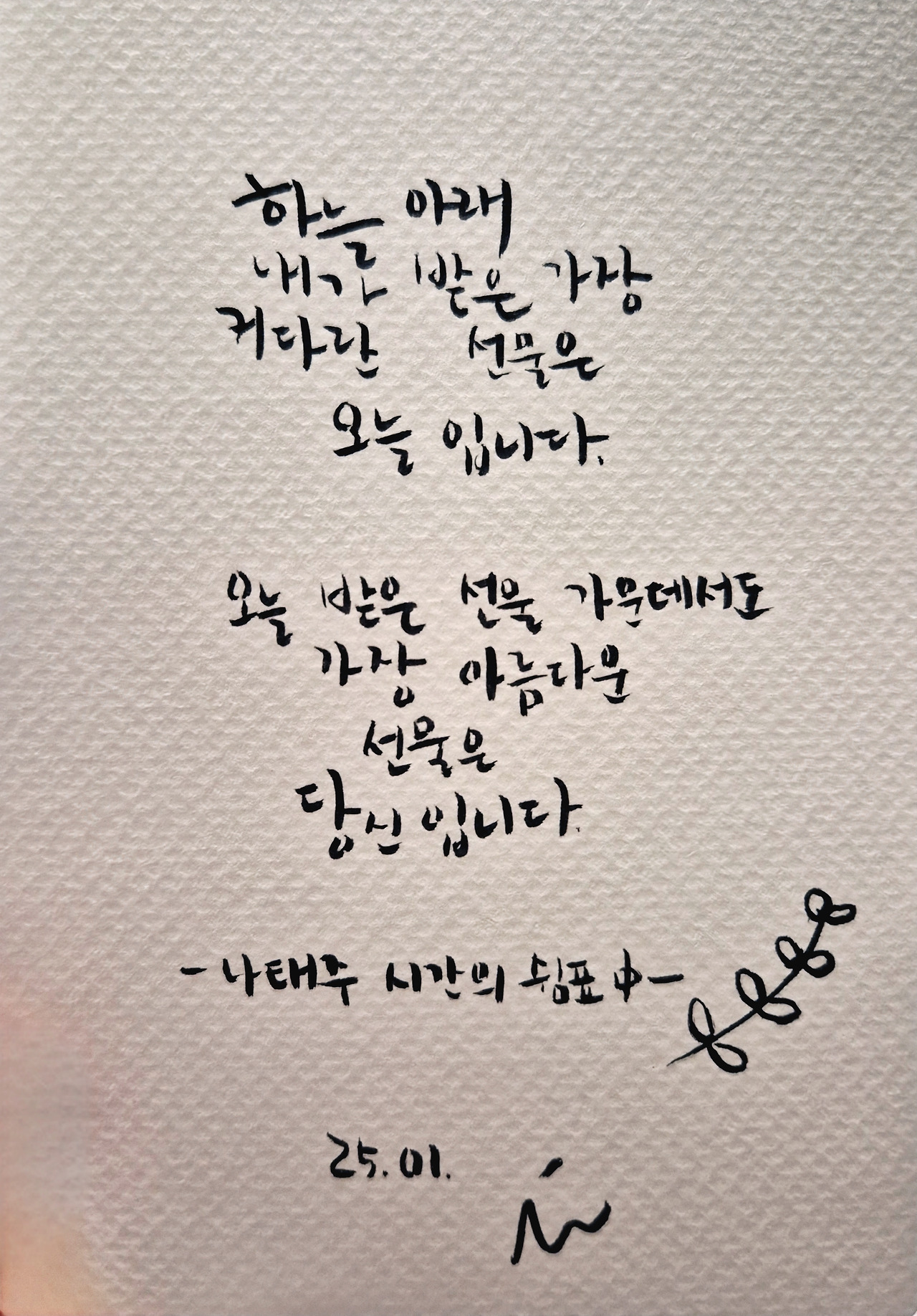 하늘 아래 내가 받은 가장 커다란 선물은 오늘입니다. 오늘 받은 선물 가운데도 가장 아름다운 선물은 당신입니다.