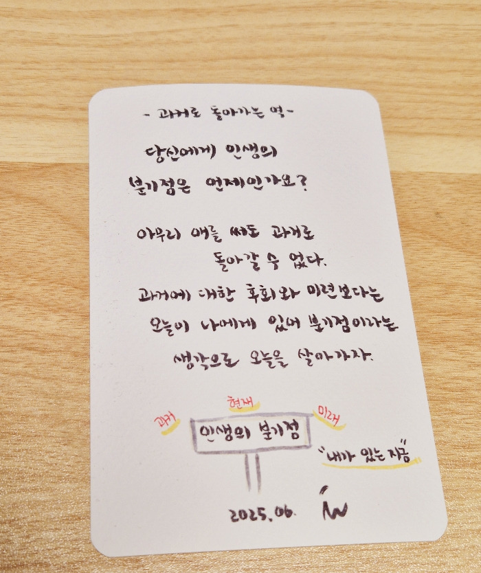 과거에 대한 후회와 미련보다는 오늘이 나에게 있어 분기점이라는 생각으로 오늘을 살아가자. 오늘이 또 다른 미래의 과거가 되어 지금 이 순간이 후회와 미련으로 남을 수도 있으니 말이다.
