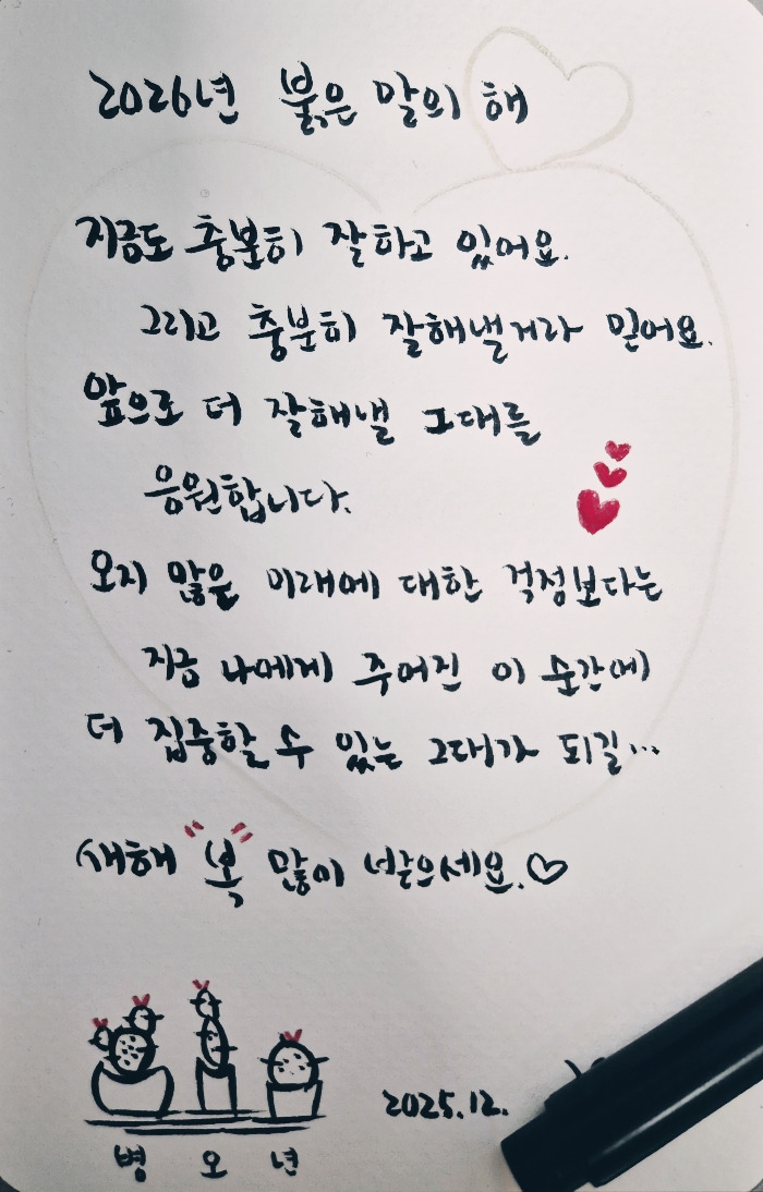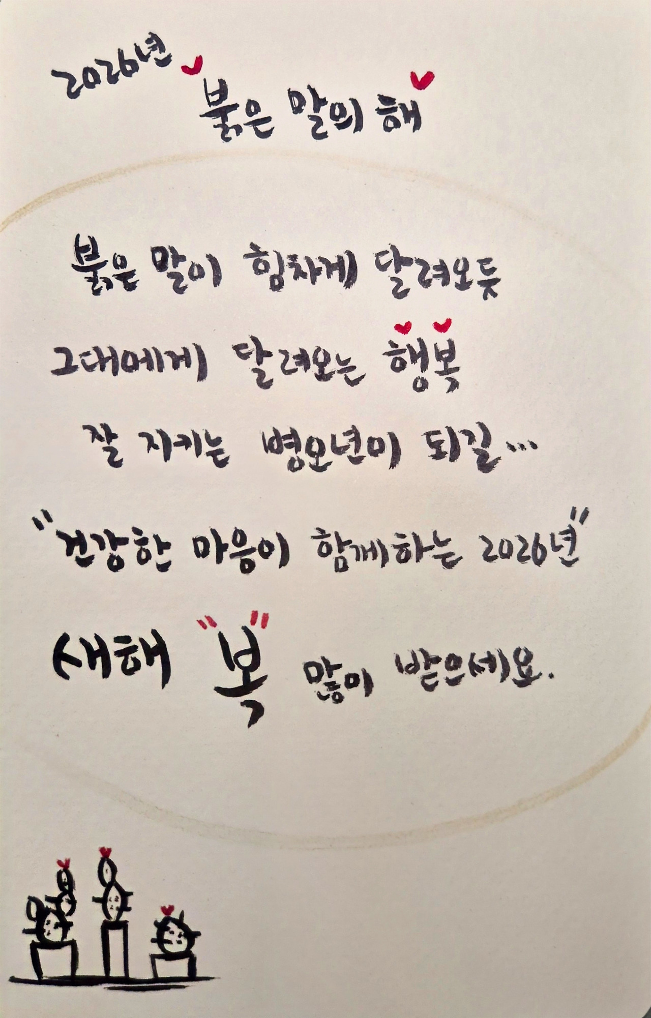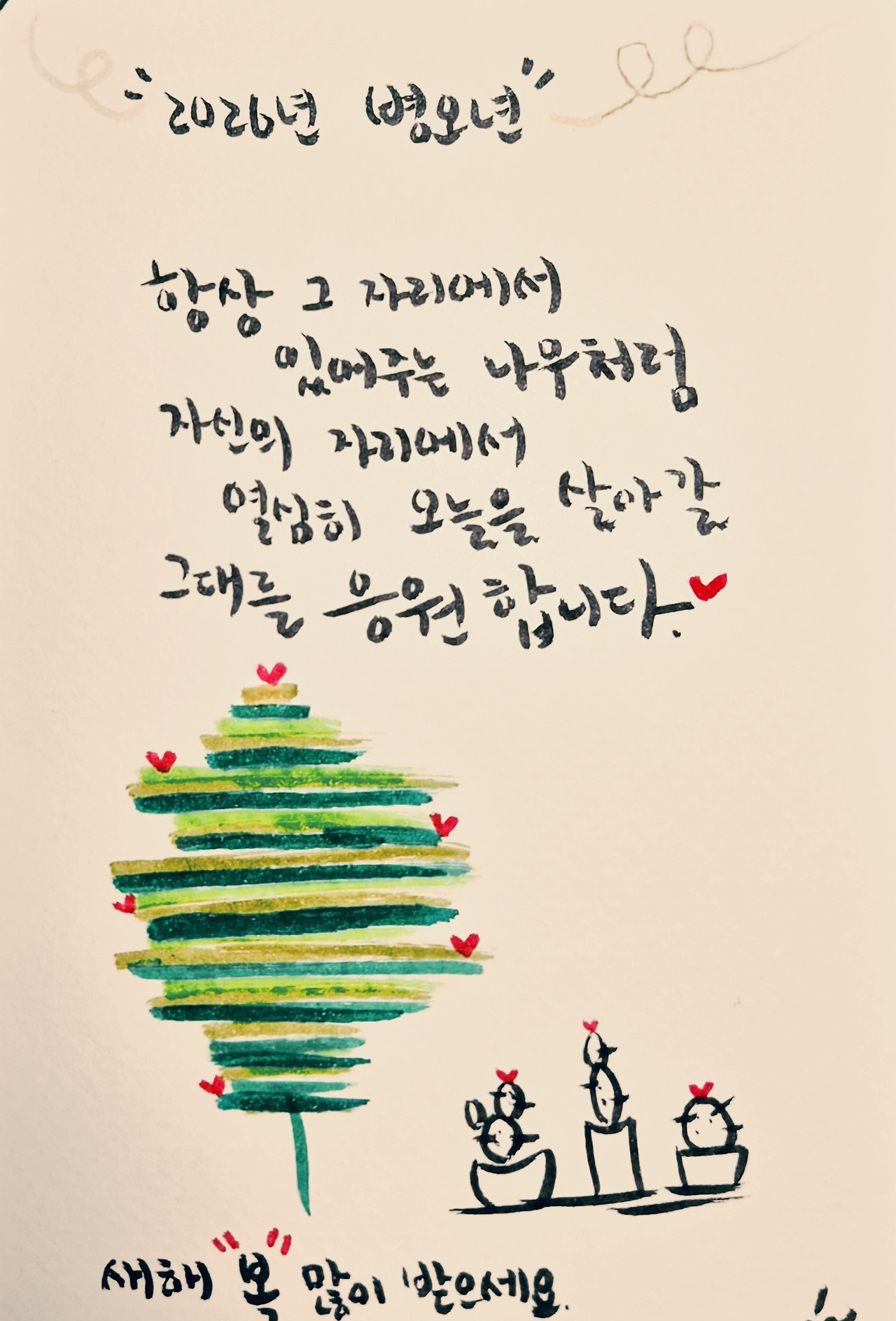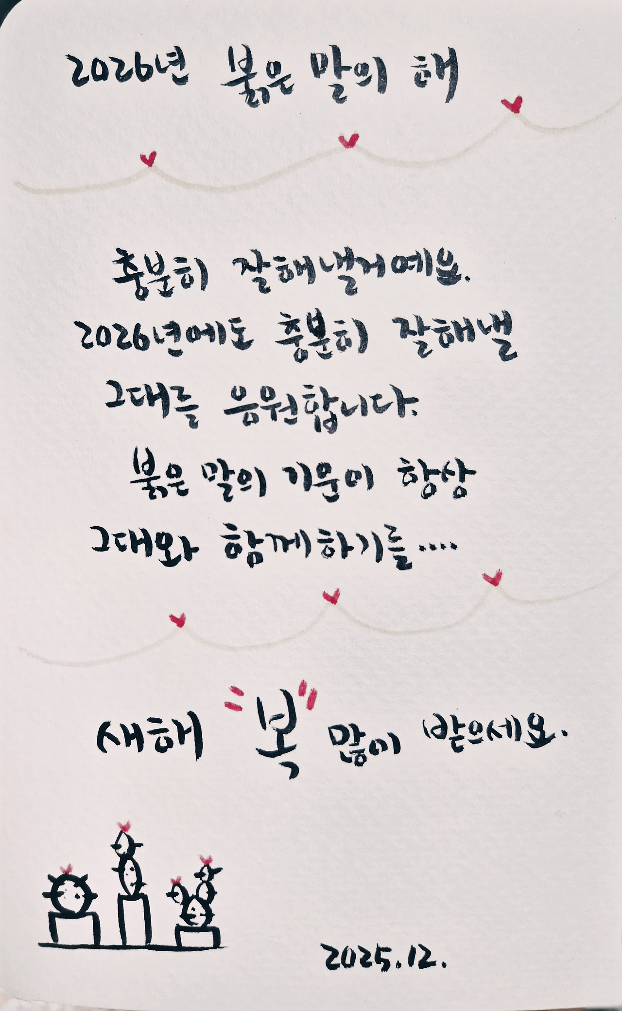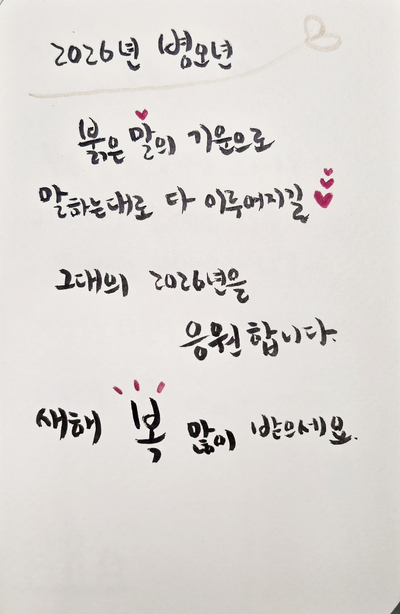 내가 할 수 있는 것으로 다른 누군가에게 작은 기쁨을 주거나 응원해 줄 수 있다는 것이 나에게 또한 위안이 된다는 것을 올해 새해 캘리를 나눠주며, 새삼 느끼게 되었다. 아직은 더 나눠줄 지인들이 있고, 매년 나의 캘리를 기다리는 지인도 있기에 틈틈이 더 열심히 써야 할 듯하다. 그 시간들을 모으면 결코 짧은 시간은 아닐 것이다. 하지만 그들을 위해 나의 시간을 내어주어도 아깝지 않다는 것만으로도, 그것만으로도 충분히 된 게 아닐까 싶다.