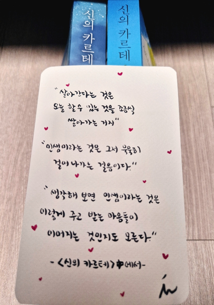 최근에 '신의 카르테'를 읽었다. 총 5권으로 구성되어 있었는데 금방금방 편하게 읽혔다. 한 병원에서 환자를 끌어당기는 마성의 의사를 중심으로 그 주변인들과 주인공이 살아가는 인생 이야기들이 시간의 흐름대로 나열되어 있었다.