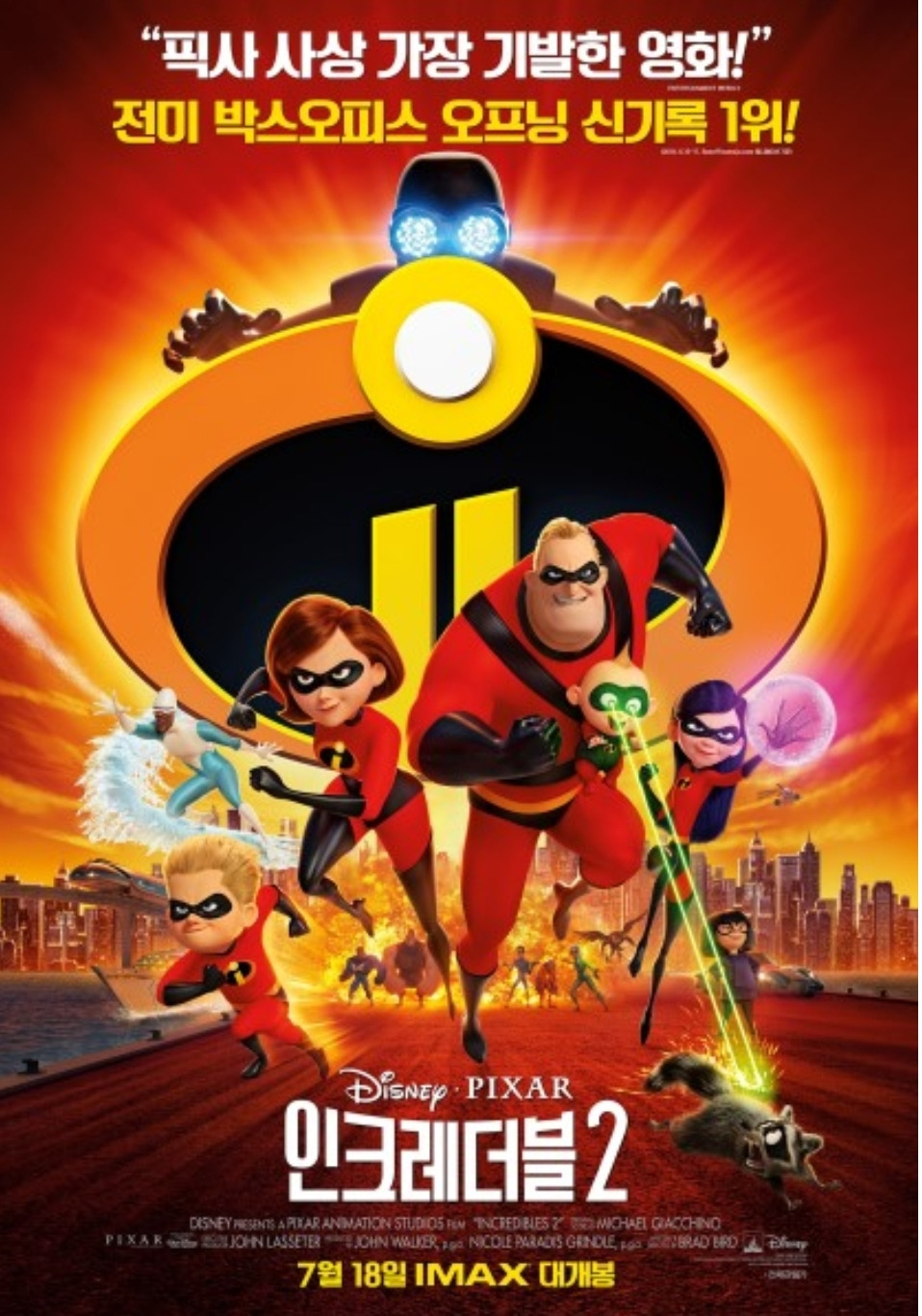 이 영화는 영화 제목처럼 아주 '인크레더블'합니다. 모든 것이 뛰어나고 모든 방면에서 뛰어나다고 해도 과언이 아닐 정도로요. 디테일과 이야기, 가족애 등 거의 모든 것이 제 맘에 들었습니다. 다만, 스크린슬레이버의 임팩트와 예상 가능한 스크린슬레이버의 정체, 어지러운 몇 개의 장면과 각각 캐릭터의 특징과 개연성 등이 조금 아쉬움을 남겼습니다. 하지만 잭잭이라는 새 캐릭터의 힘과 일라스티걸의 활약, 통쾌한 재치와 액션, 현실을 반영한 유머코드까지 이 모든 것이 그것들을 잡아줍니다. <인크레더블> 시리즈와 그리고 디즈니와 픽사 특유의 연출법이 돋보이는 영화였던 것 같습니다. 3편이 나오기를 기대하겠습니다.