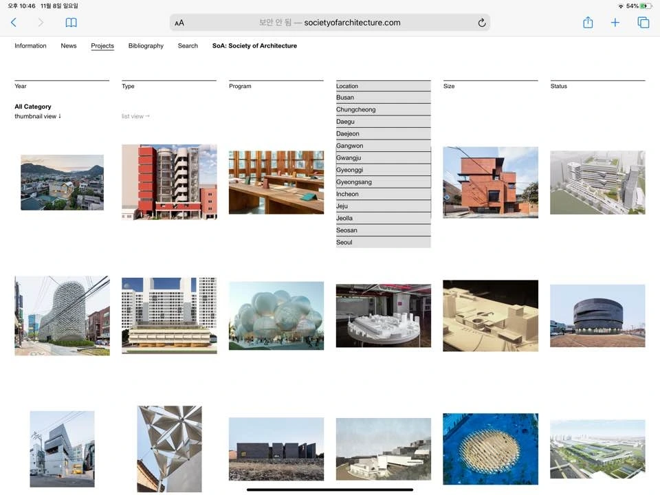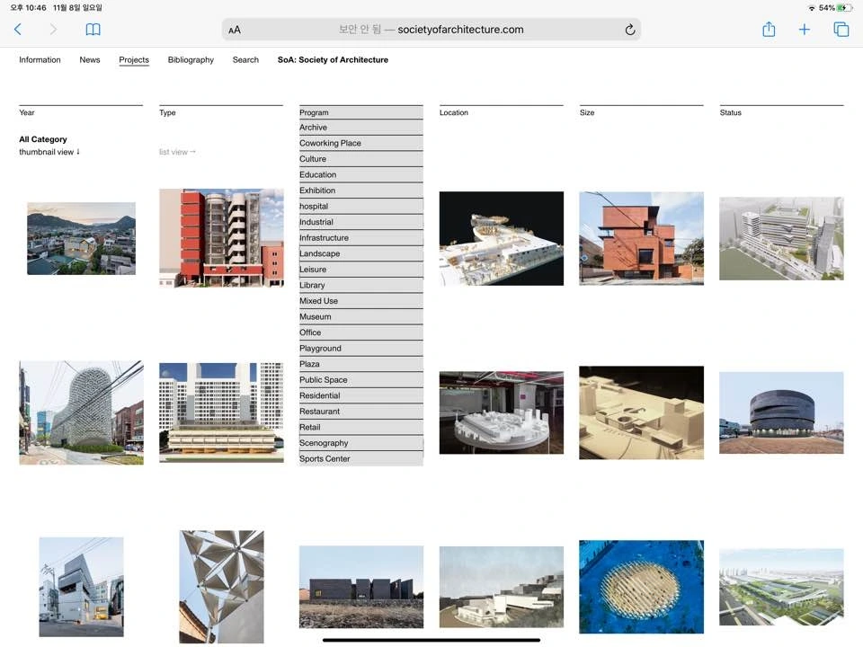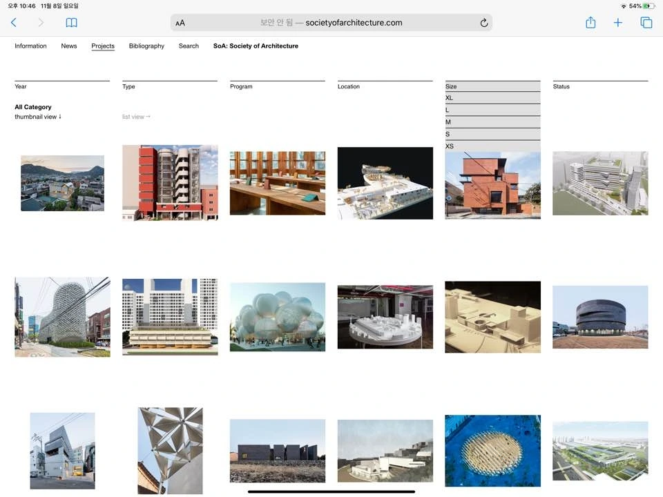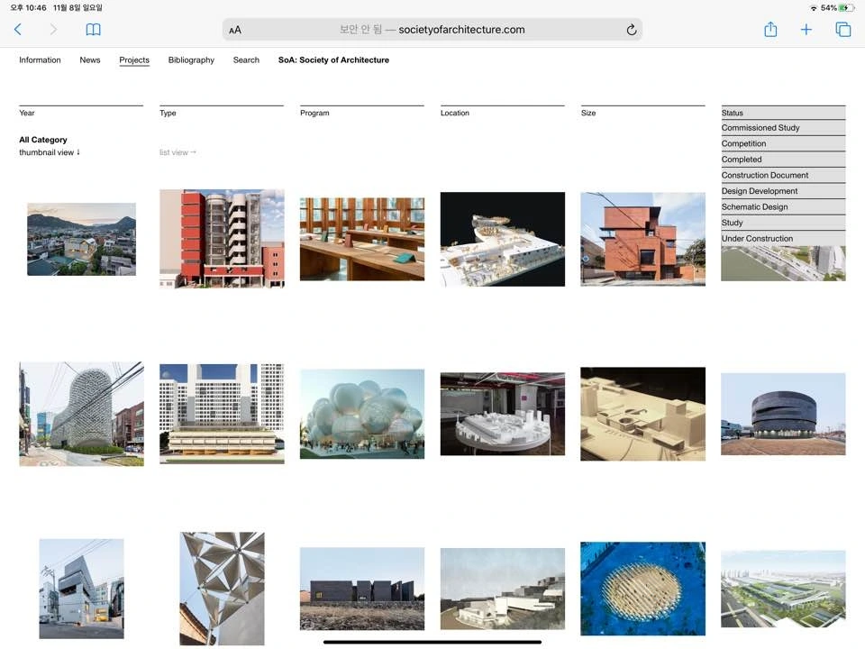 type은 building / city / object / space / things invisible 과 같이 익숙한 용어를 활용하여 생소한 구성이라고 생각했다. 건축을 ‘건물, 도시, 사물, 공간 그리고 보이지 않는 것’이라는 분류하였다. 최근 프로젝트를 분류하면서 현상에서 설계 까지 라는 양극의 그라데이션으로 표현하자는 얘기를 나누었는데 설계의 영역이 다소 모호하여 분류하기에 부족한 점을 느껴서인지 이 분류에 눈이 갔다. 프로그램 또한 기존의 용례들이나 세분화하여 나열해놓았다. 이외에는 location으로 해당 지역명이 나와있다. size의 경우에는 xs, s, m, l, xl 으로 분류했다. OMA의 Rem koolhaas와 Bruce Mau의 책이 연상되었다. 이제는 많은 사람들이 아는 기준이고 어쩌면 통용된다고까지 과장하여 말할 수 있다고 생각한다. 마지막으로 Status는 commissioned study / Competition / Completed / Construction Document / Design Development / Schematic Design / Study / Underconstruction 으로 프로젝트의 상태를 구분지었다.