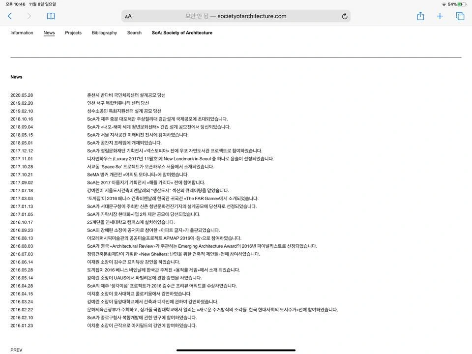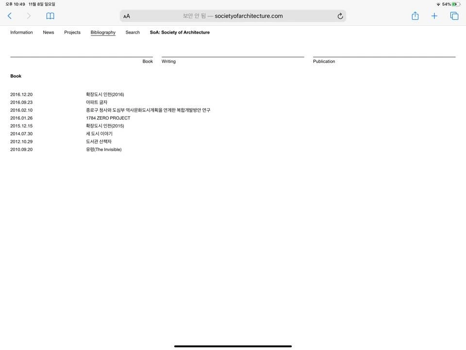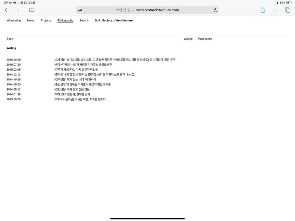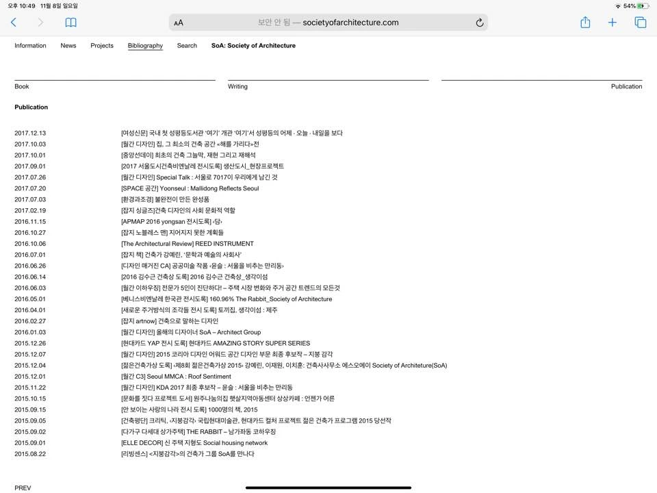 bibliography의 경우 프로젝트와 구분되는 SoA의 저술 작업들을 모아놓았다. 그 분류는 Book / Writing / Publication으로 구성했다. 2018년 젊은 건축가 도록에서 박성진 에디터는 건축가들의 글쓰기가 조금 더 많아져야한다는 메시지를 담아 적은 프롤로그를 읽은 적이 있었다. 목록을 따라 내려가면서 훑어봐야하는 그들의 저술 작업을 보니 ‘SoA가 그 모범이 되는 건축가이지 않을까?’라는 생각이 들었다.