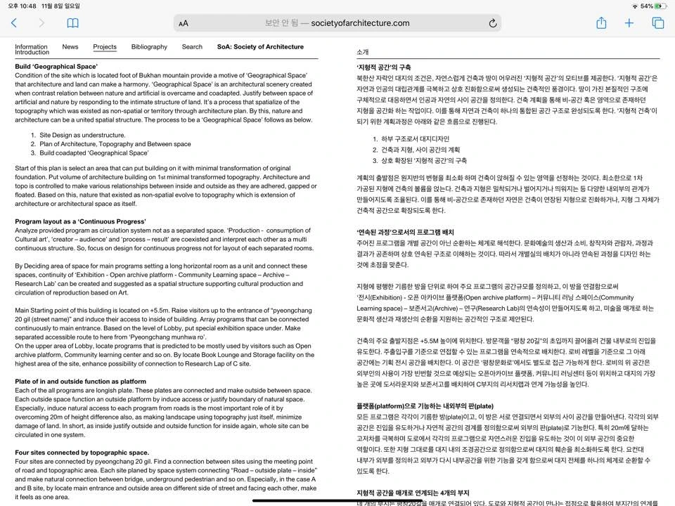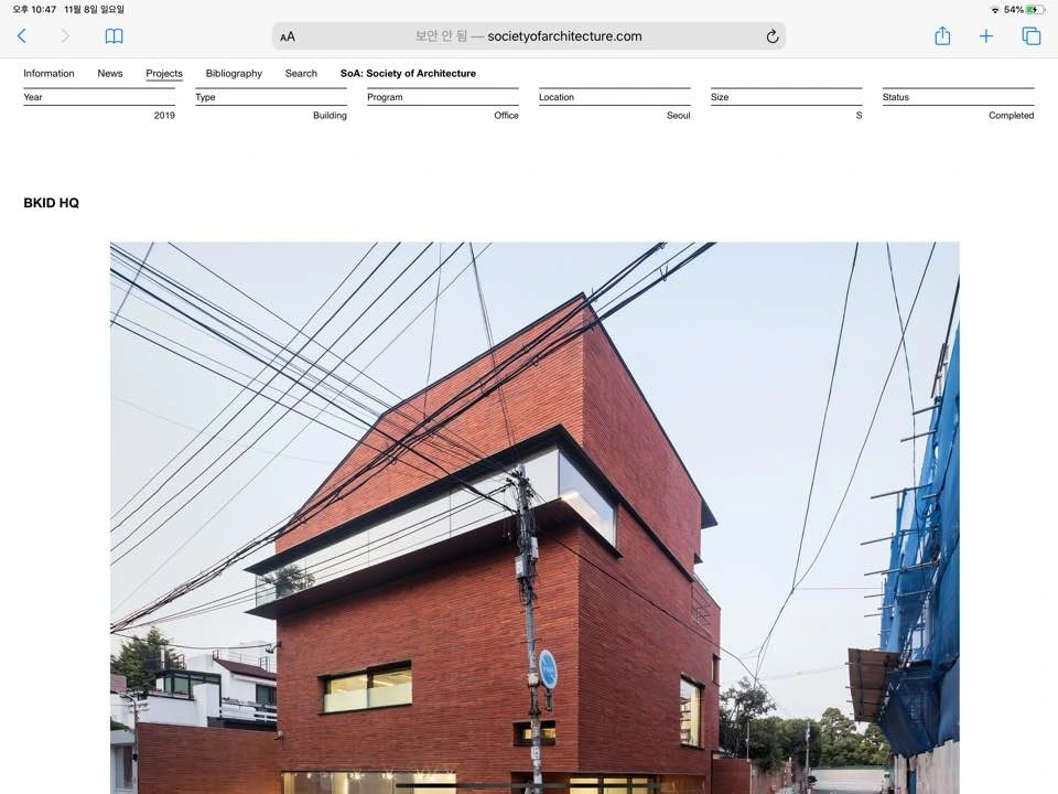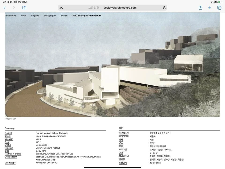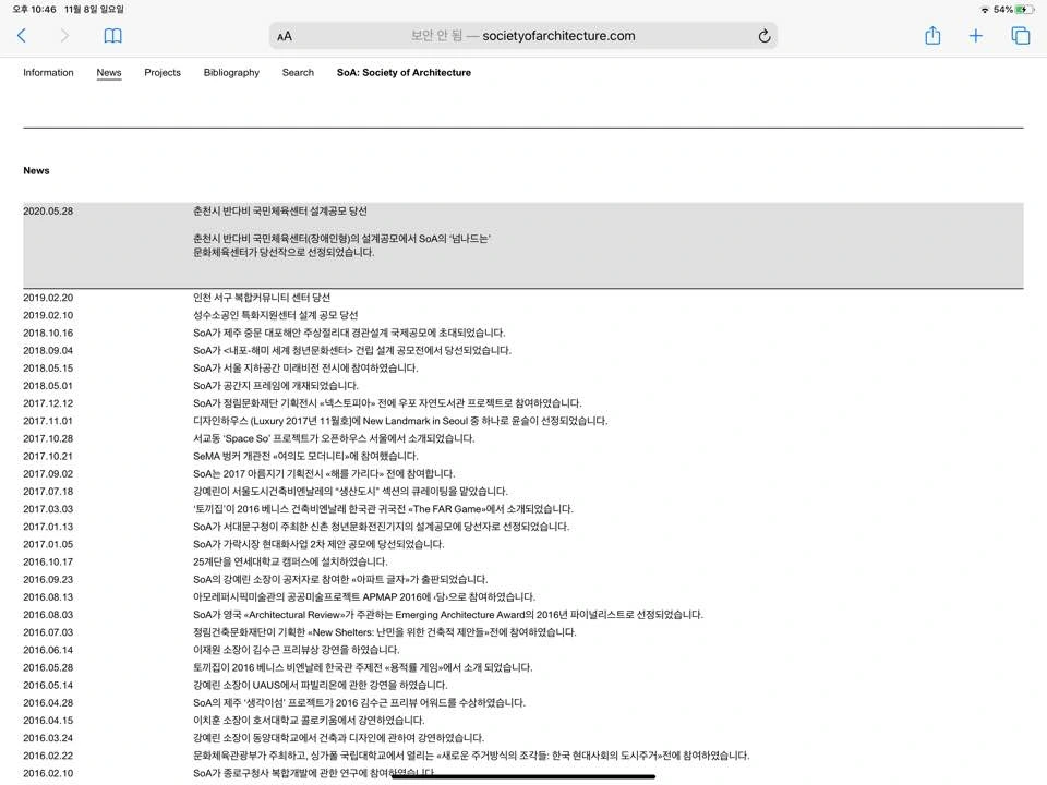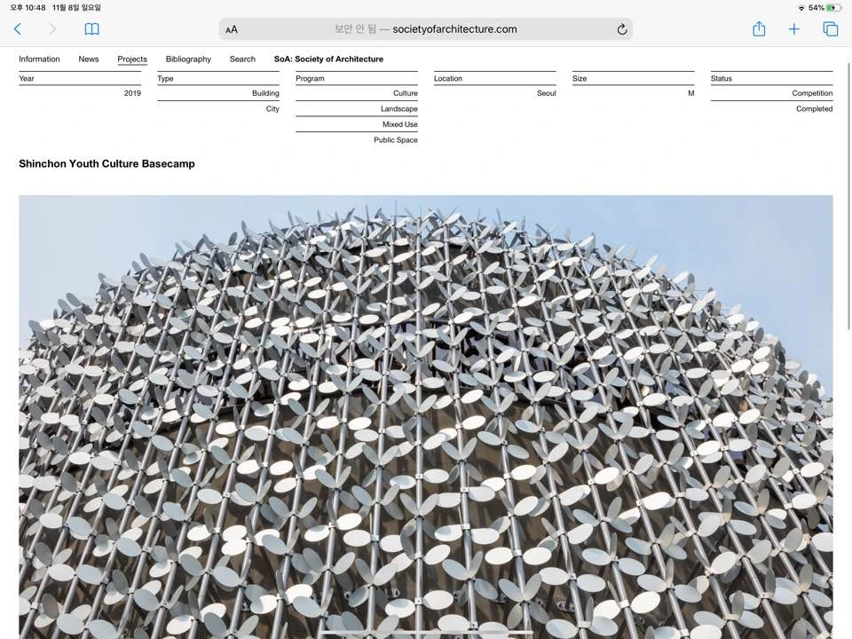 bibliography의 경우 프로젝트와 구분되는 SoA의 저술 작업들을 모아놓았다. 그 분류는 Book / Writing / Publication으로 구성했다. 2018년 젊은 건축가 도록에서 박성진 에디터는 건축가들의 글쓰기가 조금 더 많아져야한다는 메시지를 담아 적은 프롤로그를 읽은 적이 있었다. 목록을 따라 내려가면서 훑어봐야하는 그들의 저술 작업을 보니 ‘SoA가 그 모범이 되는 건축가이지 않을까?’라는 생각이 들었다.