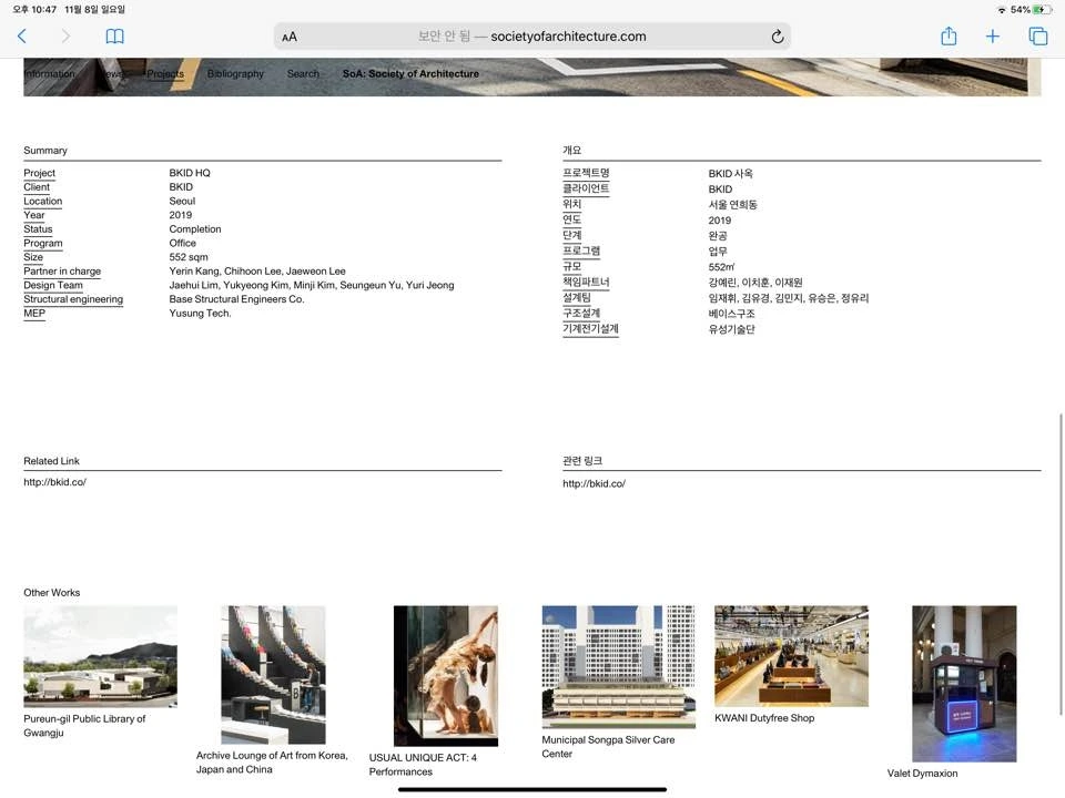 개별 프로젝트는 개요에 대해서 소개하고 화면을 채우는 이미지를 하나씩 넘기면서 보는 체계로 되어 있다. 조진만 건축사사무소와 동일하게 참여 인원들의 이름을 적어놓았다. 물론 주요 협력사도 적어놓았다. 그리고 이 프로젝트의 성격은 상단에 연도, 유형, 프로그램, 위치, 크기, 상태로 구성하여 기술하여 놓았다.