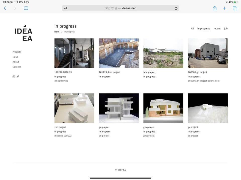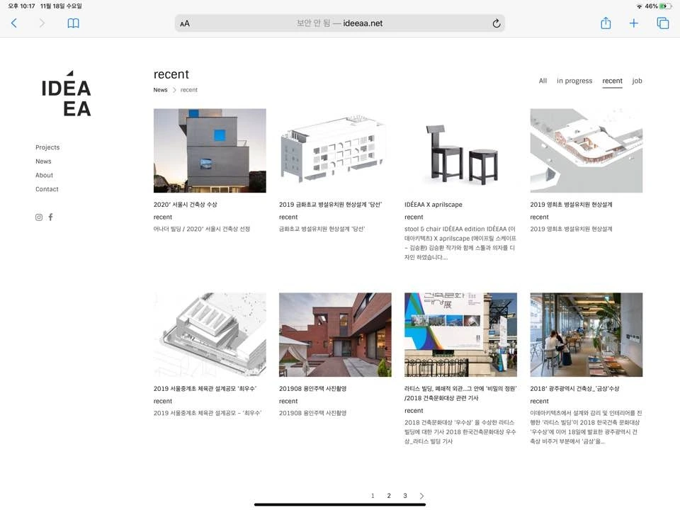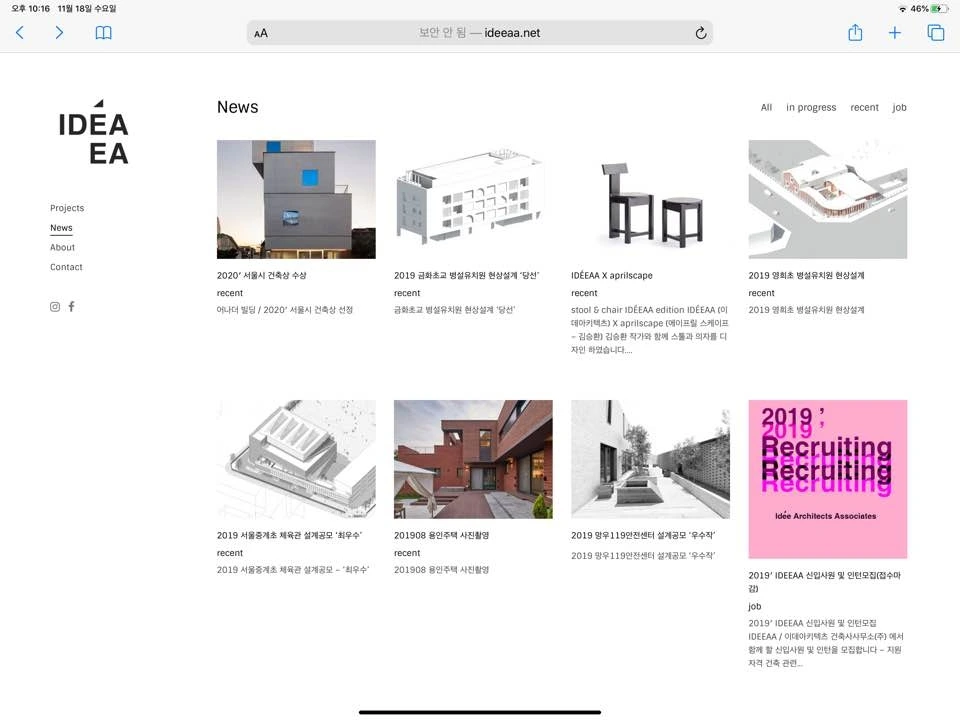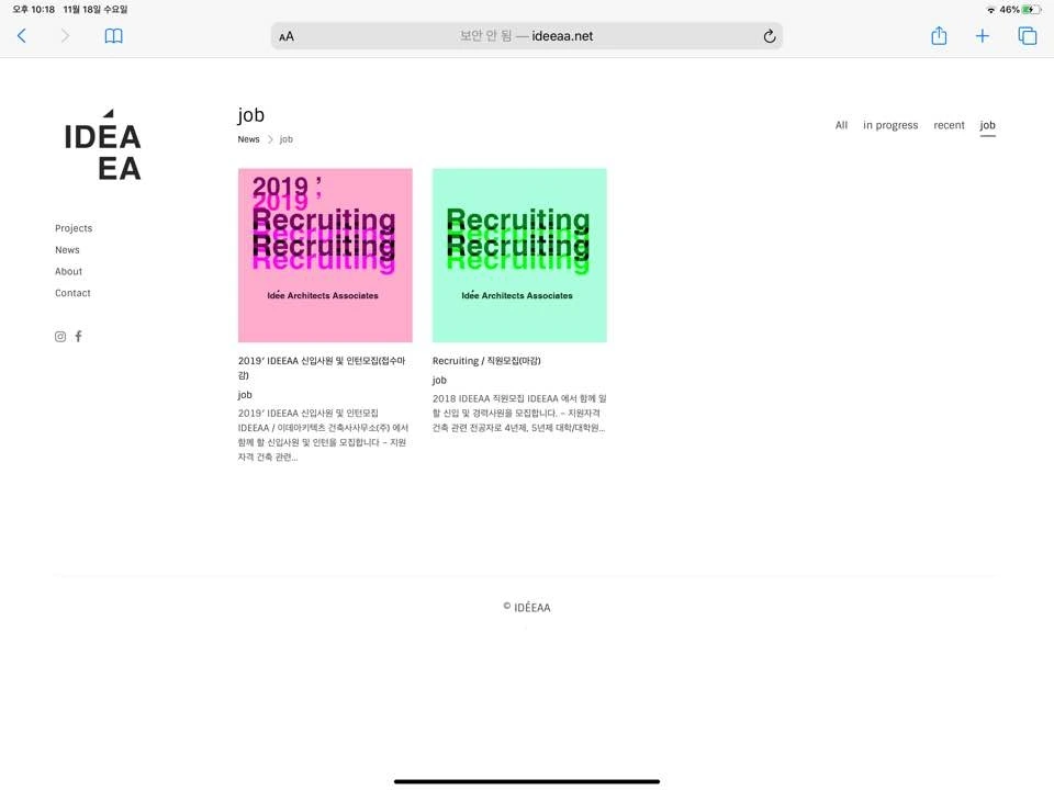 News 분류에는 다른 웹사이트와 비교했을 때 상대적으로 다양한 정보가 나열되어 있다고 생각했다. 그래서인지 News란에서도 작은 소분류가 있다. in progress / recent / job 으로 구성되어 있다. in progress는 그들의 최근 작업의 진행상황을 보여준다. 자세한 설명이 있진 않지만 공사 현장, 미팅을 위한 모형, 핵심 개념을 담은 것으로 보이는 개념 모형 등의 사진으로 그들의 근황을 게시한다. recent는 최근 수상 이력 혹은 참여 전시 등의 일반적인 news에 대한 부분을 게재한다. 마지막으로 job은 그들이 채용 공고를 낼때마다 저곳에 공지글을 게재하는 것으로 보인다.