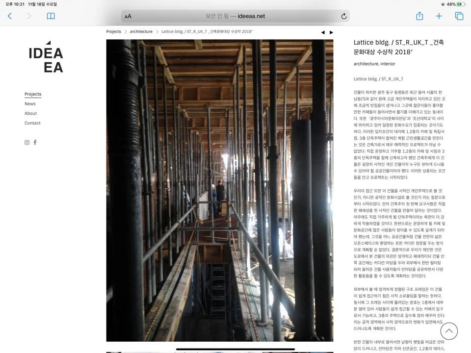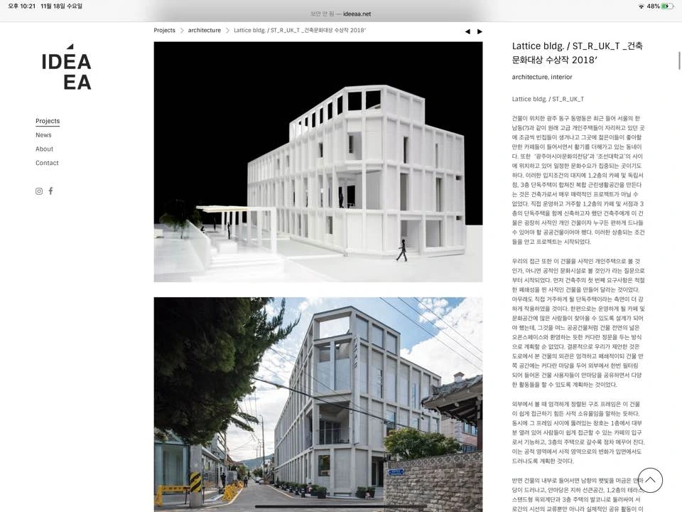 들어간 첫페이지에 그들의 작업들을 슬라이드 쇼로 보여준다. 눈에 띄는 점은 건물이 주인공이기보다는 매 장면에서 사람들의 활동이 주요하고 배경으로서 기능한다고 생각했다. 사이트의 전체적인 카테고리는 Projects / News / About / Contact와 그들의 인스타그램과 페이스북이 링크되어 있다.