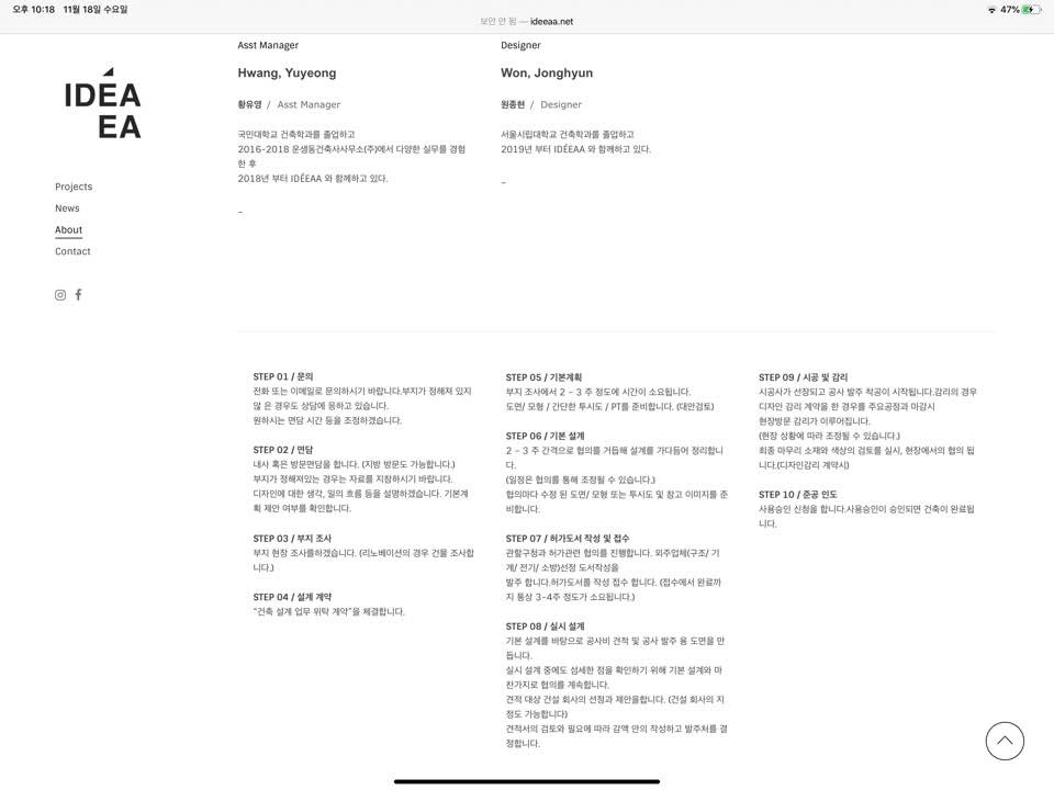 about에는 그들이 지향하고자 하는 방향성에 대한 그들의 노력과 태도에 대해서 설명하고 있다. 아래에는 수상이력이 나열되어 있다. 그 하단에는 소장 세분의 이력과 직원들의 간략한 이력을 적어놓았다. 하나의 건축가 집단으로서 그들의 방향성을 설명했다고 생각했다. 그런데 각 소장들의 개별 이력과 함께 각자가 지향하는 건축에 대해 짧은 글이 덧붙어져 있다.