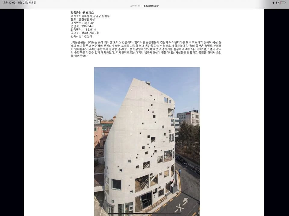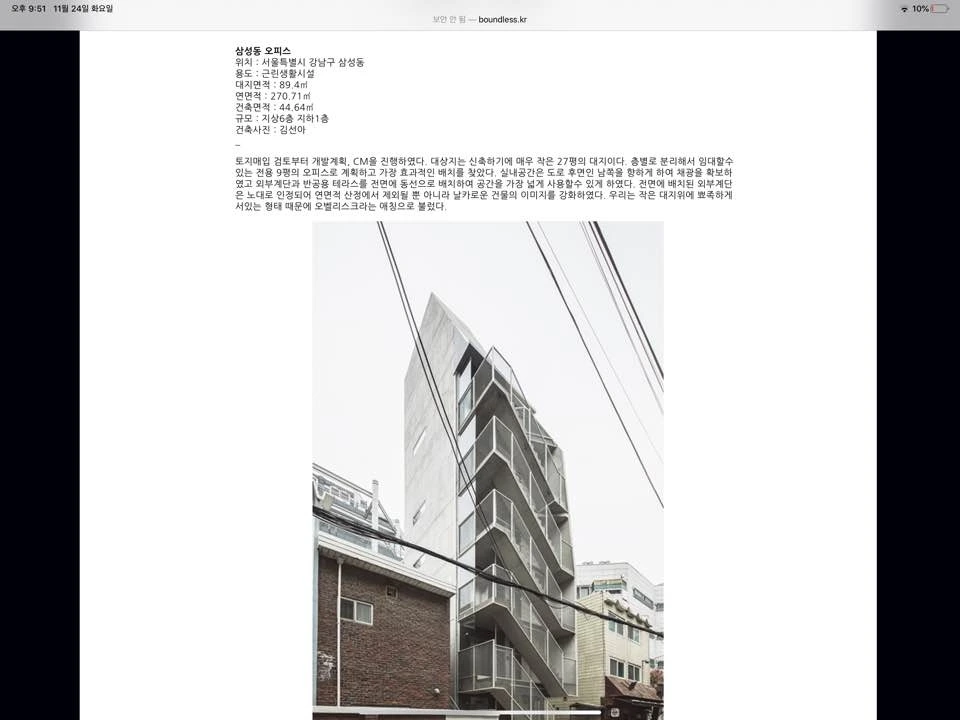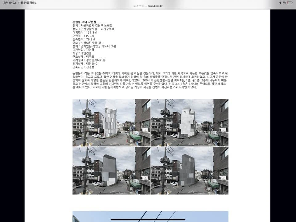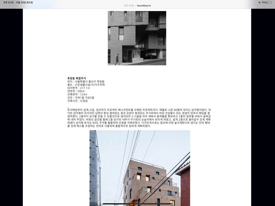 projects에서는 그들이 한 ‘일’에 대해서 설명을 하고 있다. 이를테면 ‘토지매입부터 설계, 시공, 임차까지 프로젝트 매니지먼트를 수행한 프로젝트이다.’ 라고 설명한다. 작업물의 건축적 소개나 공간적 특성이 아니라 그들이 한 일을 설명함으로서 웹사이트를 방문한 클라이언트는 그들에게 받을 수 있는 서비스가 어떤 것인지에 대해 조금 더 구체적으로 생각하여 올 수 있겠다고 생각했다. 또한 굳이 건축적으로 좋은 공간을 확보했다고 어렴풋한 설명 대신 그들은 용적률을 확보하고 분양이 잘 될만한 포인트를 계획하며 법적인 제한을 해결한 디자인 솔루션을 소개한다.