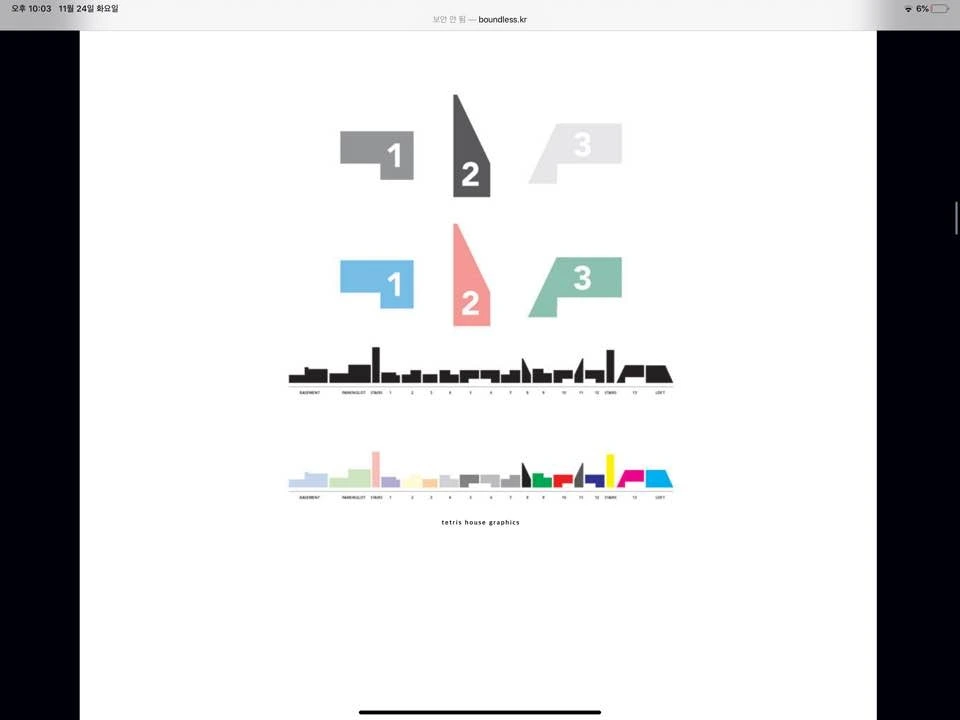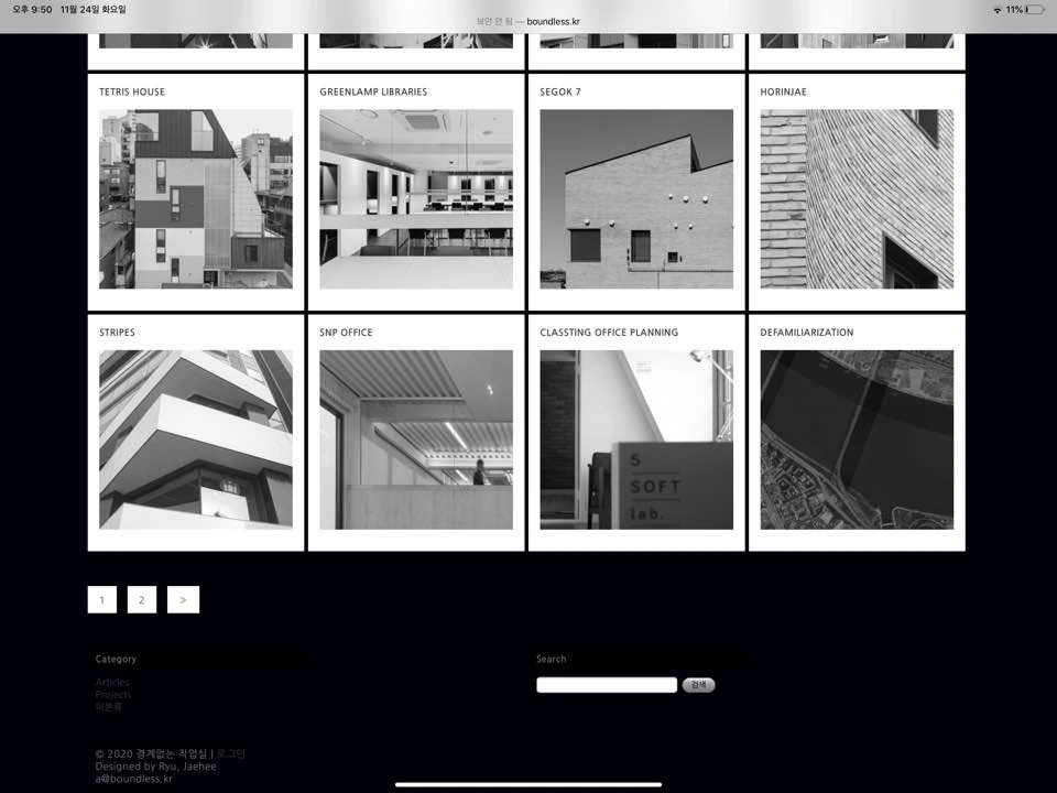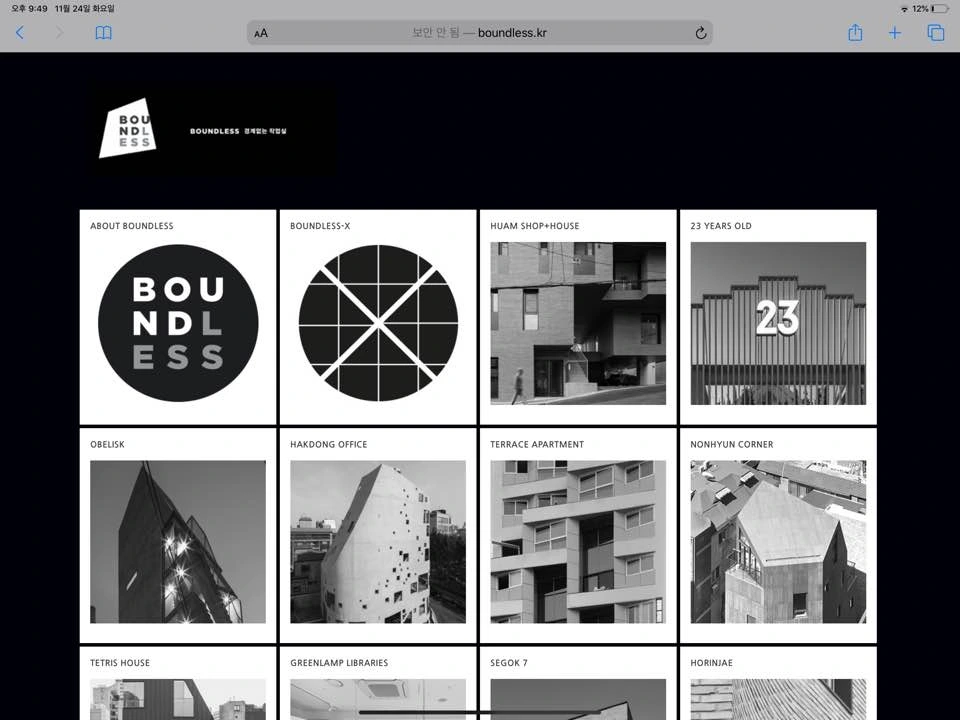 ‘경계없는 작업실’이란 사무소의 이름에 대한 개인적인 기대감과 달리 첫페이지의 모든 이미지가 색이 없고 이미지 하나 하나 모두 프레임 속에 있었다. 혹시나 하는 마음에 마우스를 올려보아도 이미지에 색이 돌지는 않았다. 대신 상단에 BOUNDLESS라는 글자는 고정된 채 배경의 흰 사각형이 계속 점의 위치를 달리하며 모양을 바꾸어 보여준다.