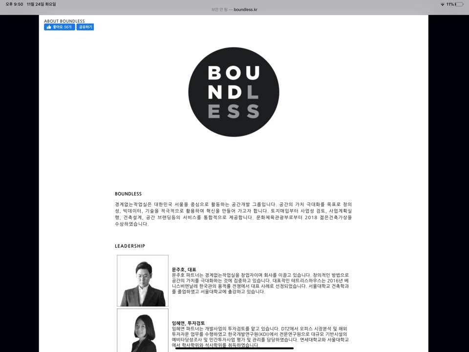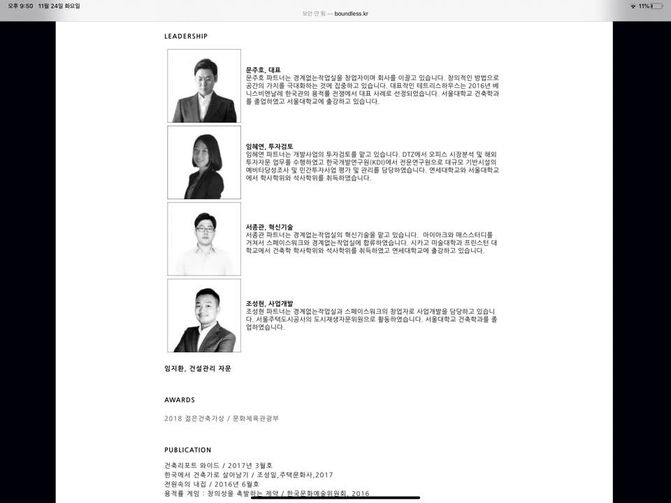 위와 같이 건축이 공간이 되는 그 일부의 과정뿐만 아니라 공간이 갖는 가치를 극대화하는 것에 그 포커싱이 있다는 것을 설명한다. 이를 설명하는 또 다른 방식으로 ‘리더십’ 파트를 보여준다. 다른 사무소의 경우 ‘파트너’라는 단어를 사용하여 스스로를 설명하지만 경계없는 작업실은 대표와 함께 투자검토, 혁신기술, 사업개발, 건설관리 자문 이라는 담당 파트를 적어놓음으로서 그들의 업무의 스펙트럼을 보여준다고 생각했다.