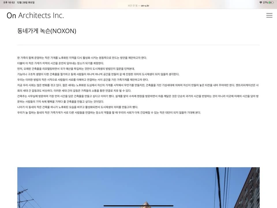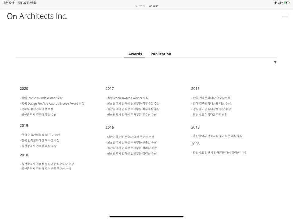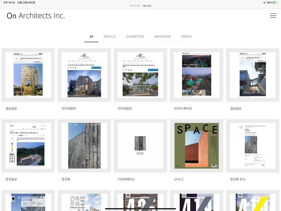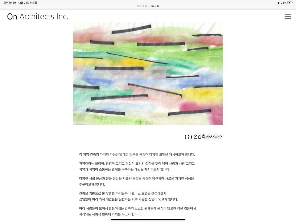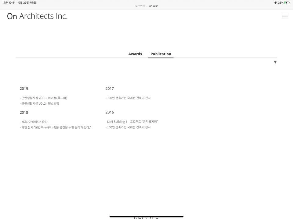 오늘 살펴볼 젊은 건축가의 웹사이트는 ‘온 건축사사무소’의 웹사이트이다. 이 사이트를 보면 지난 2015년 이후부터 올해 2020년의 젊은 건축가 수상자들의 사이트를 모두 살펴보는 것이다. 이제 겨우 18팀을 살펴본 것인데 발견하고 곱씹을만한 것들을 많이 마주친 것 같다. 이제 정말 사이트를 살펴보자.