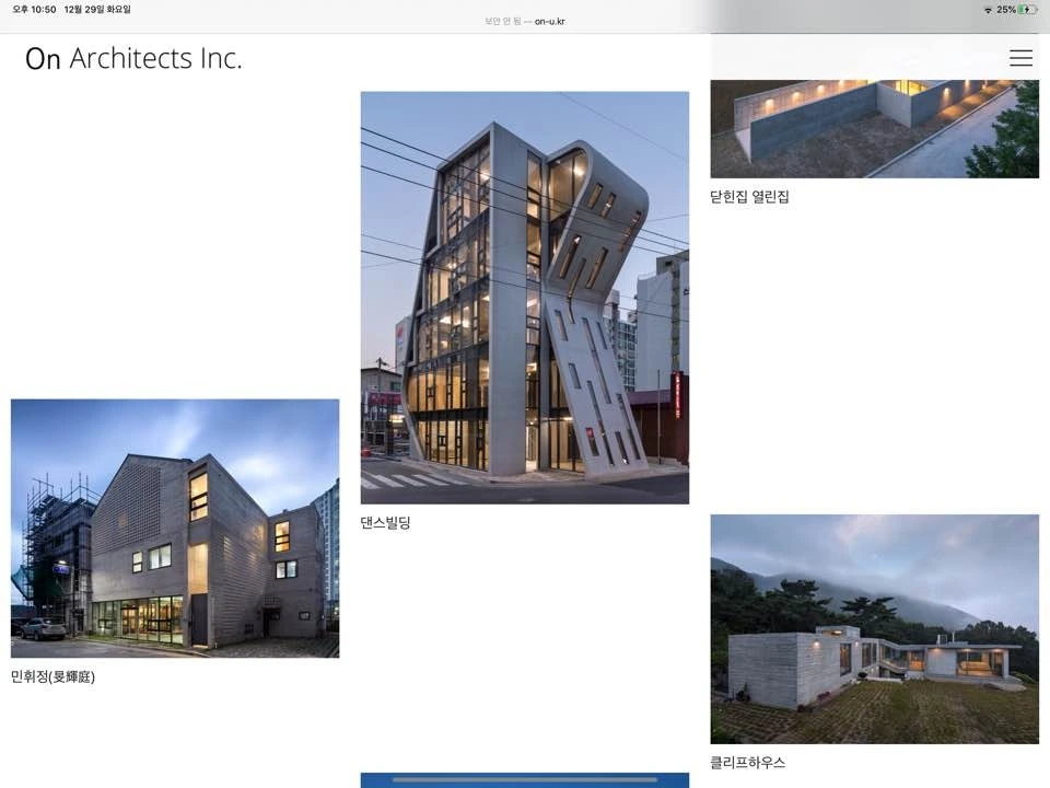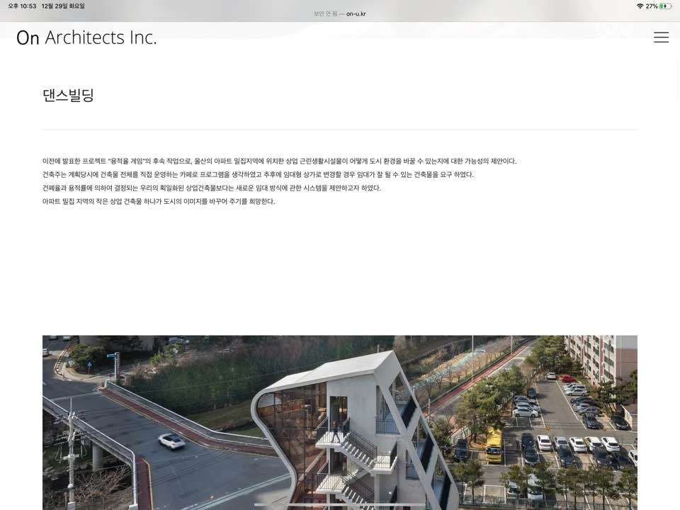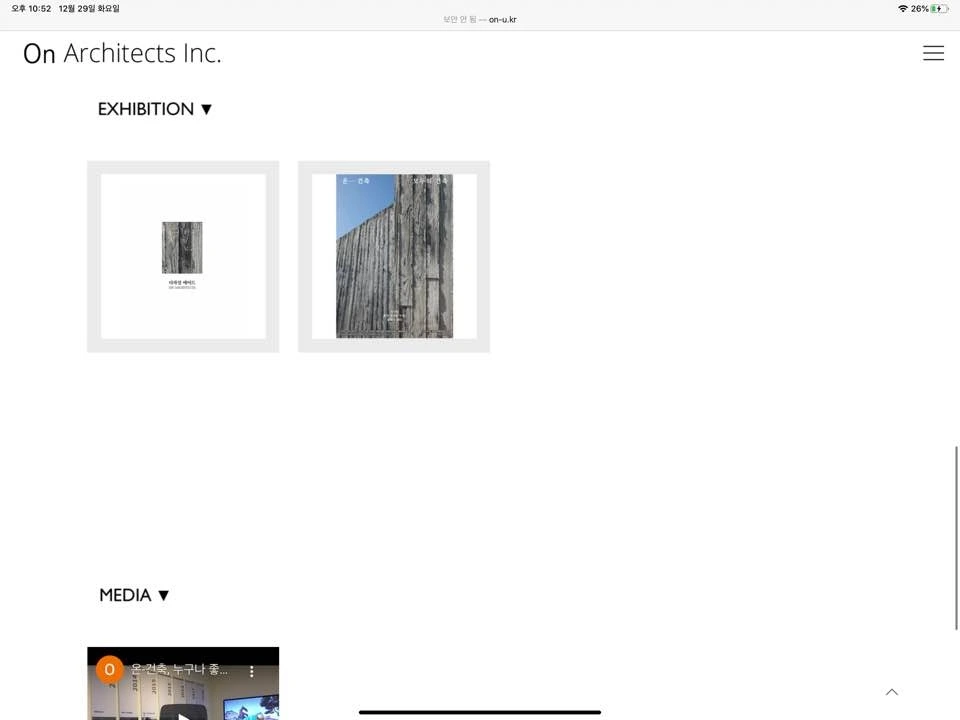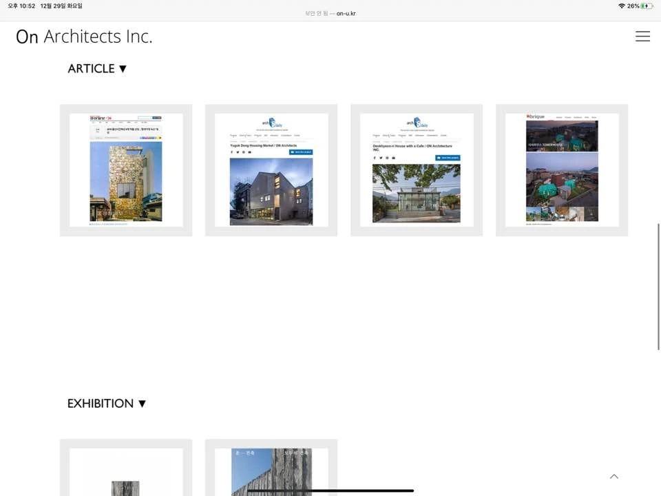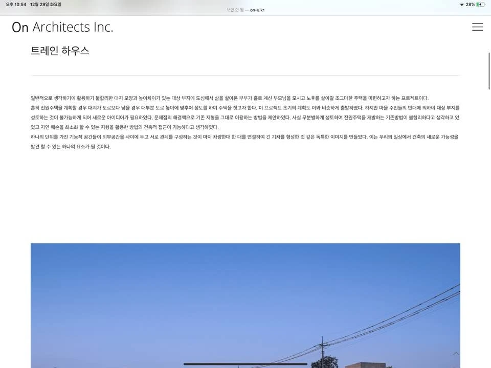 오늘 살펴볼 젊은 건축가의 웹사이트는 ‘온 건축사사무소’의 웹사이트이다. 이 사이트를 보면 지난 2015년 이후부터 올해 2020년의 젊은 건축가 수상자들의 사이트를 모두 살펴보는 것이다. 이제 겨우 18팀을 살펴본 것인데 발견하고 곱씹을만한 것들을 많이 마주친 것 같다. 이제 정말 사이트를 살펴보자.