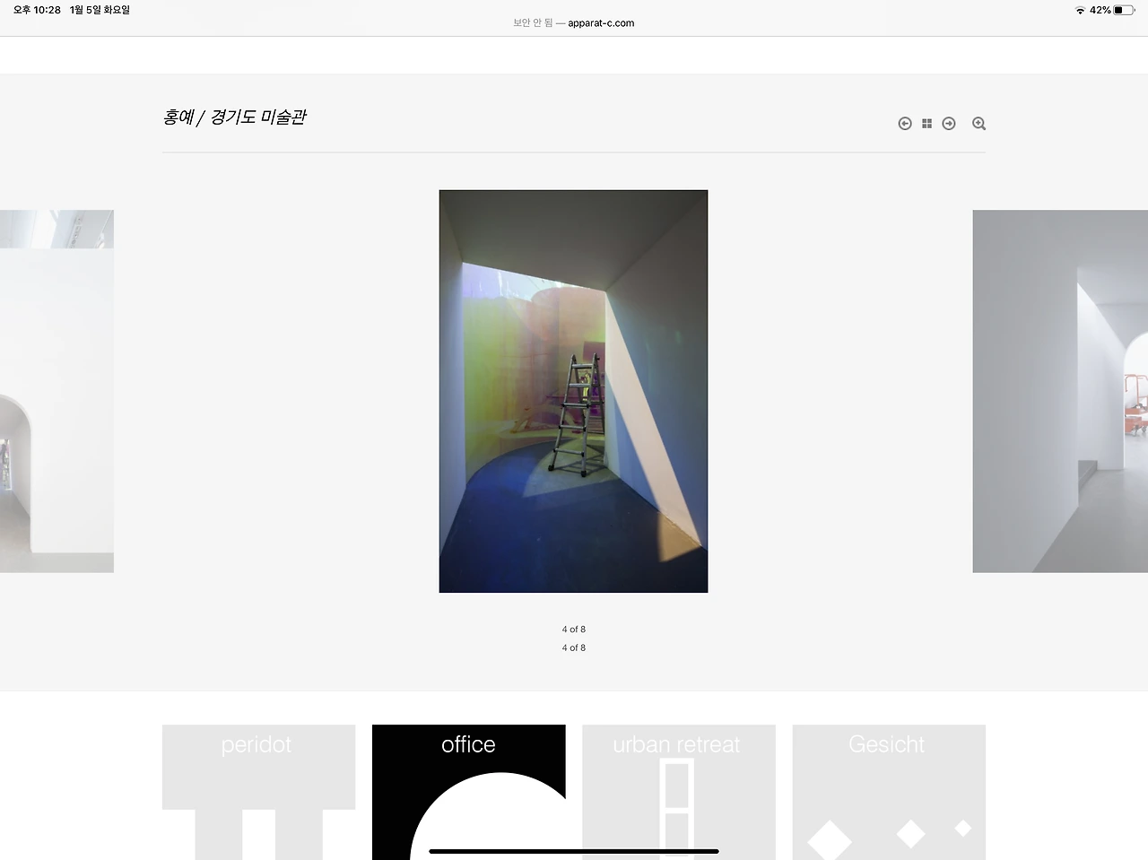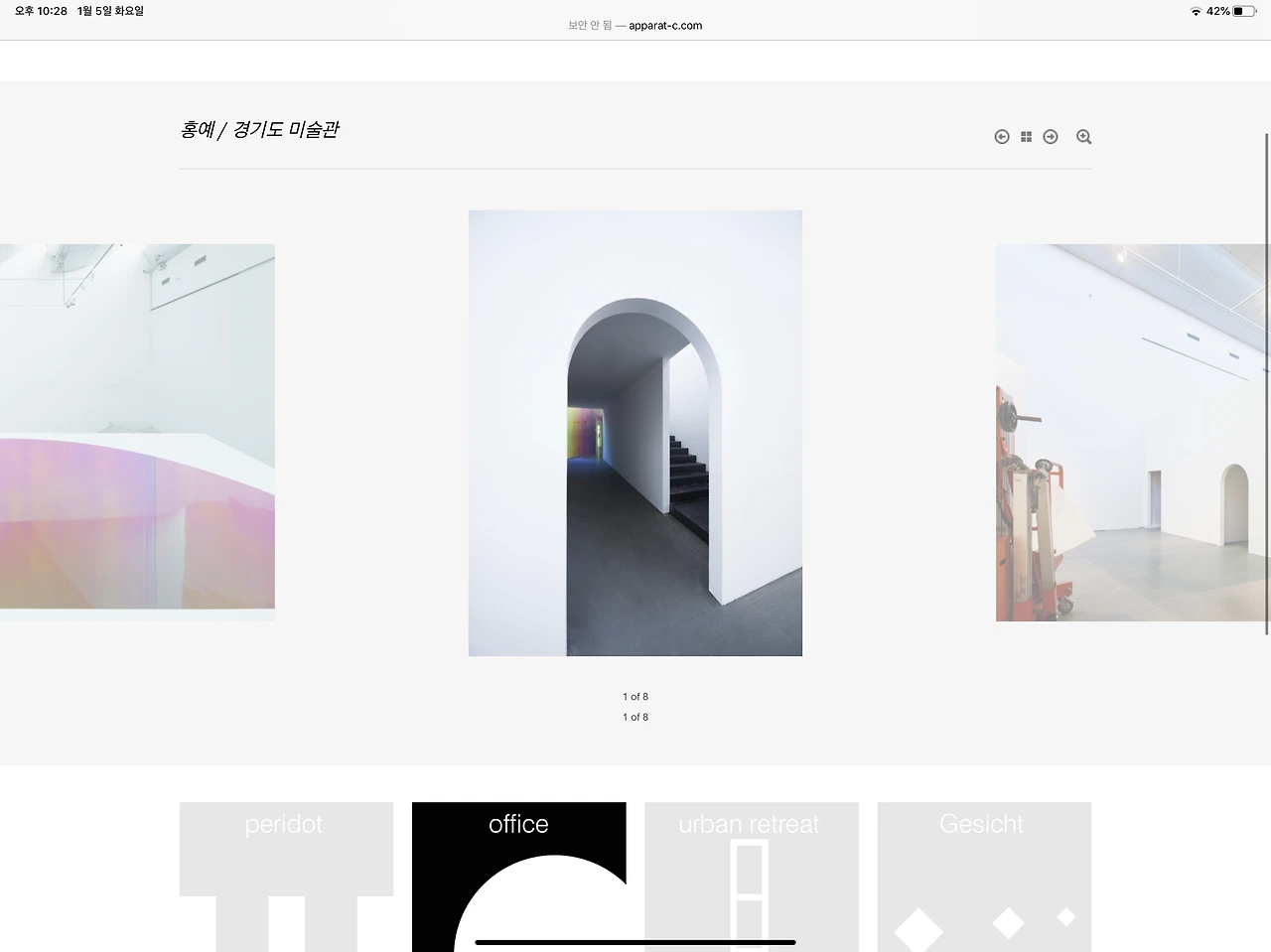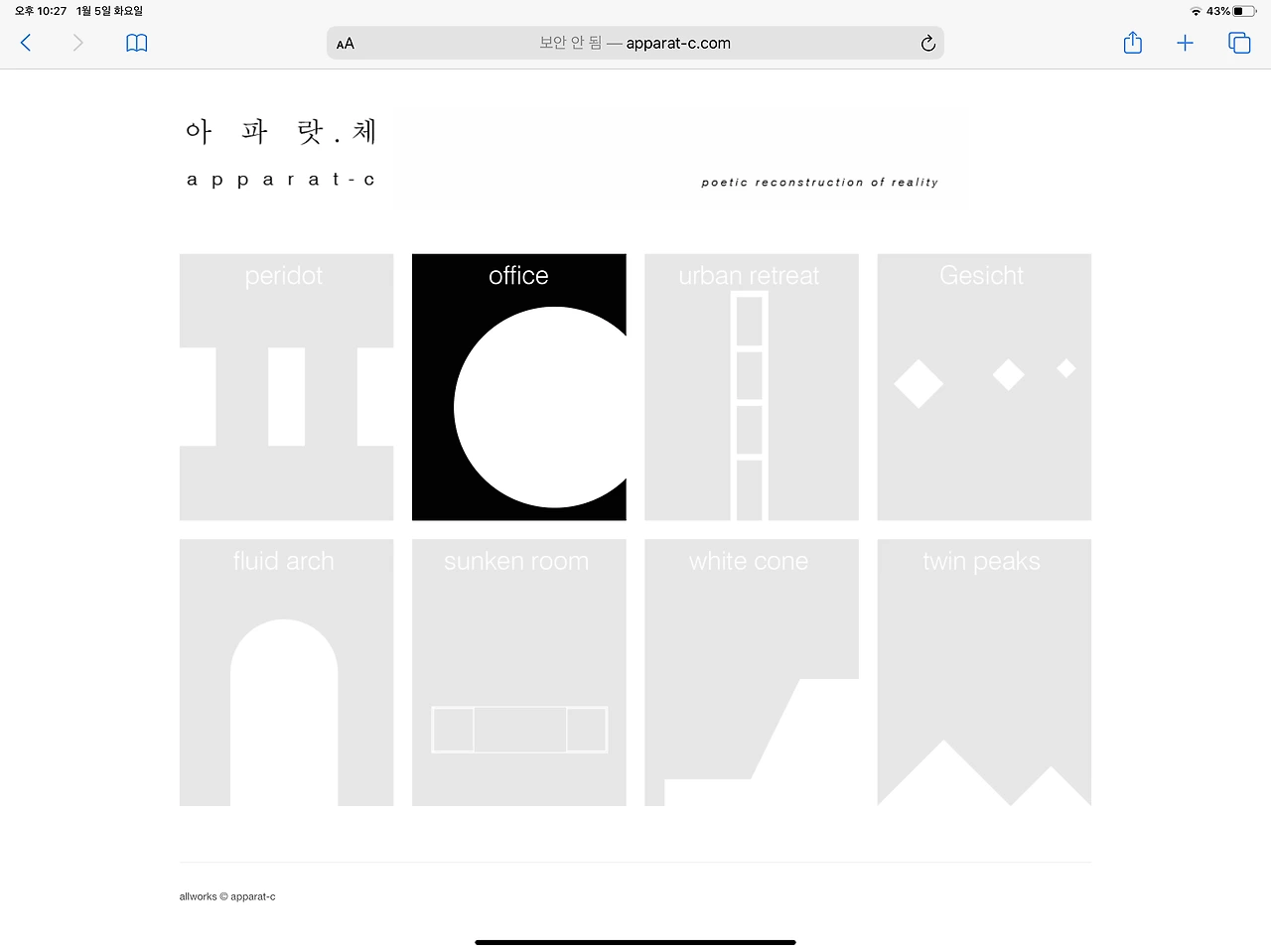 사이트의 첫 화면 구성은 얇은 폰트의 단어들과 면으로 구성된 기하 그림 카드들이 배열되어있다. 웹사이트의 구성이라고 할 것도 없었다. office라는 하나의 그림 카드가 진하게 돋보일 뿐이다. 그 외에는 모두 프로젝트들의 나열이다. 위 그림 카드들이 프로젝트의 대표적 기하를 나타낼 것임은 추측이 되는데 office의 원형이 완전한 원이 아닌채 일부가 잘린 이유에 대한 설명을 기대하면서 office를 눌러보았다.