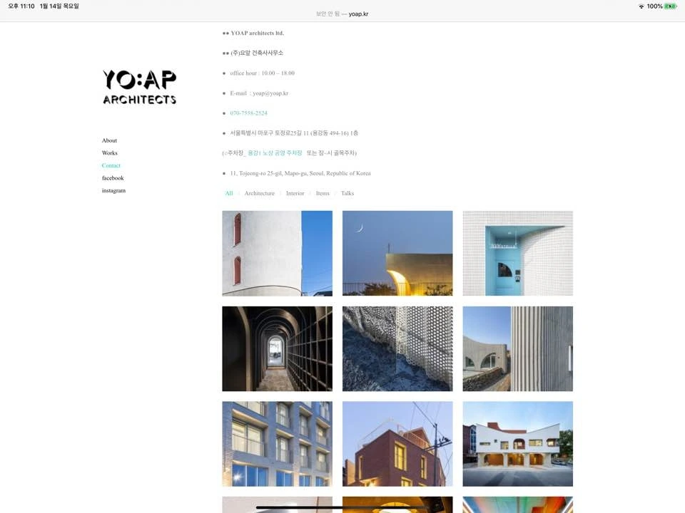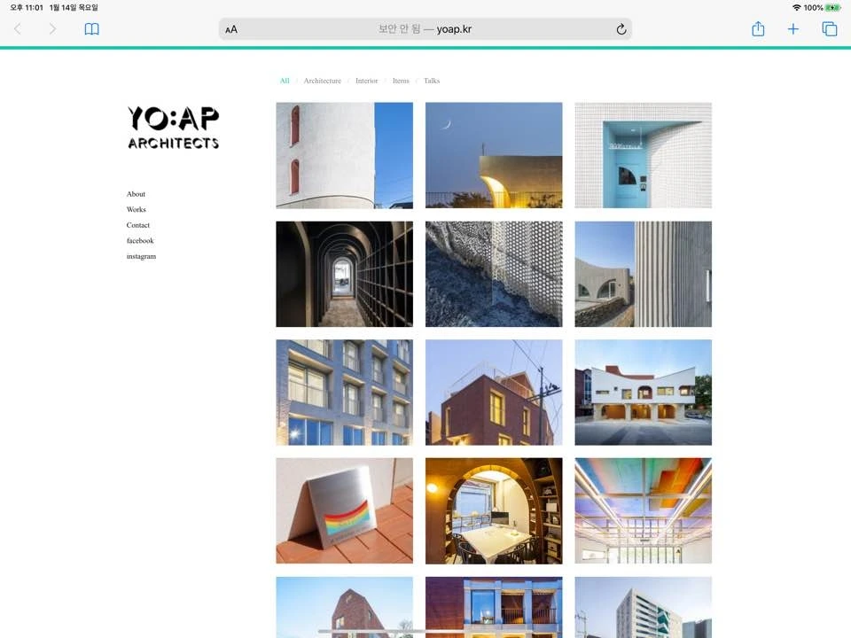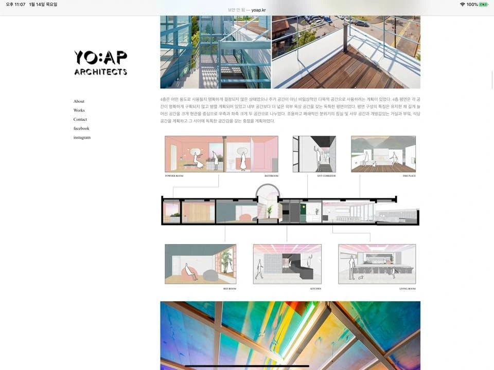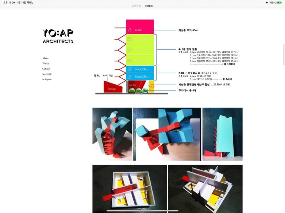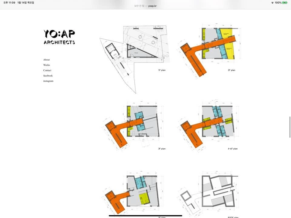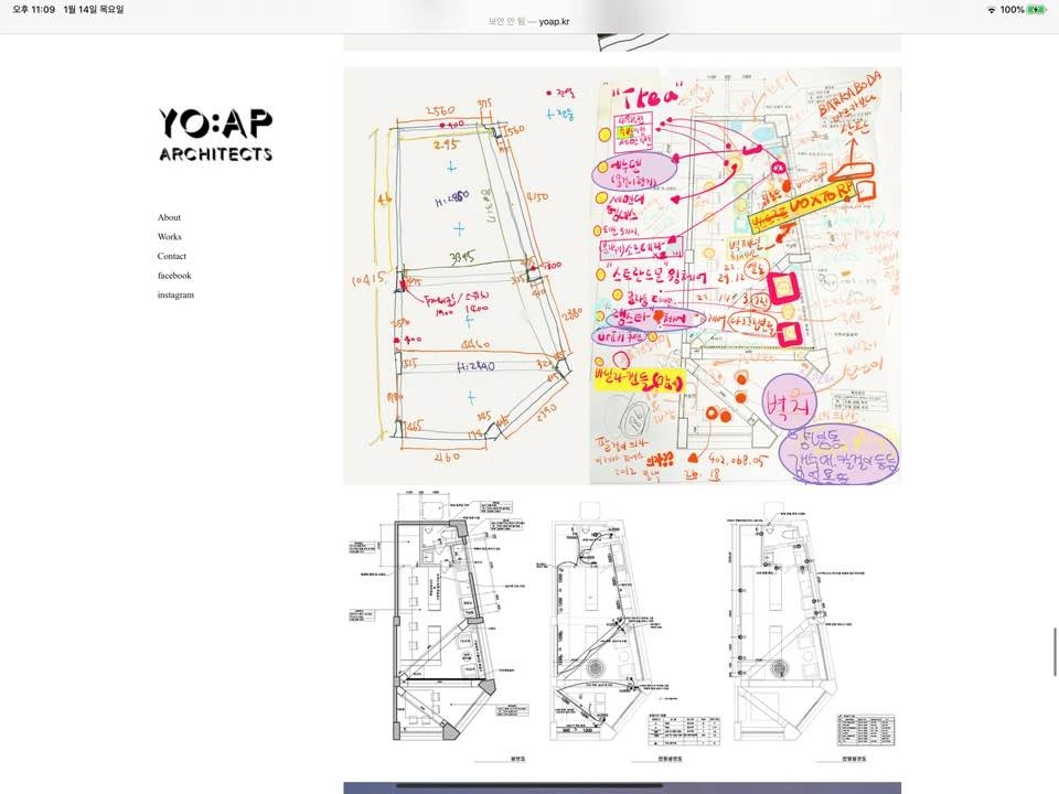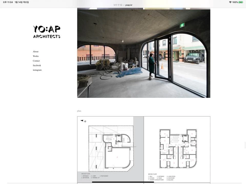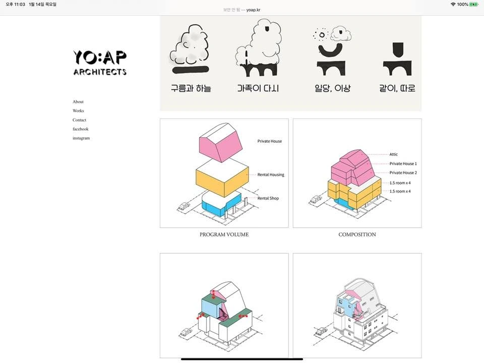 요앞 건축사사무소의 작업들을 소개하는 방식은 굉장히 친절하다는 느낌을 받았다. 언제 설계해서 시공하였고 준공되었는지에 대한 이야기에서부터 건물의 곳곳을 함께 둘러보듯 많은 양의 이미지와 생생한 설명을 함께 기술해놓았다. 또한 활용하는 매체도 사진, 평면, 모형, 다이어그램, 스케치, 근접샷, 원경샷 등 그 종류도 다양했다. 그리고 works의 세부 분류도 흥미로웠다. architecture / interior / item / talks 로 구성되어 있다. item과 talks 에는 브랜딩, 리서치, 가구, 기획, 고찰 등 다양한 이야기들이 있다. 다른 사무소였다면 works에 포함되지 않고 따로 카테고리가 있을 내용인데 이 사무소는 works에 있는 것이 어울린다고 생각했다. 다른 건축, 인테리어 작업에도 자세한 설명이 동반이 되어서 이것들의 설명이 이질적이지 않다고 생각했다.