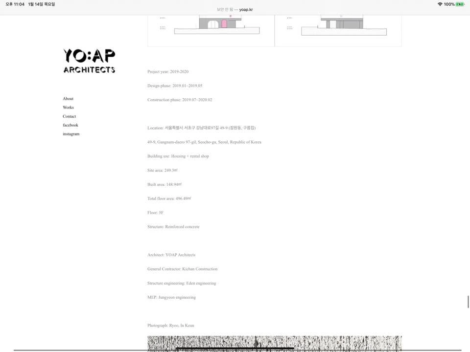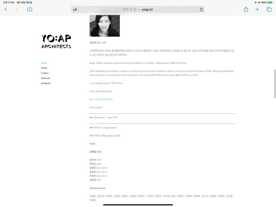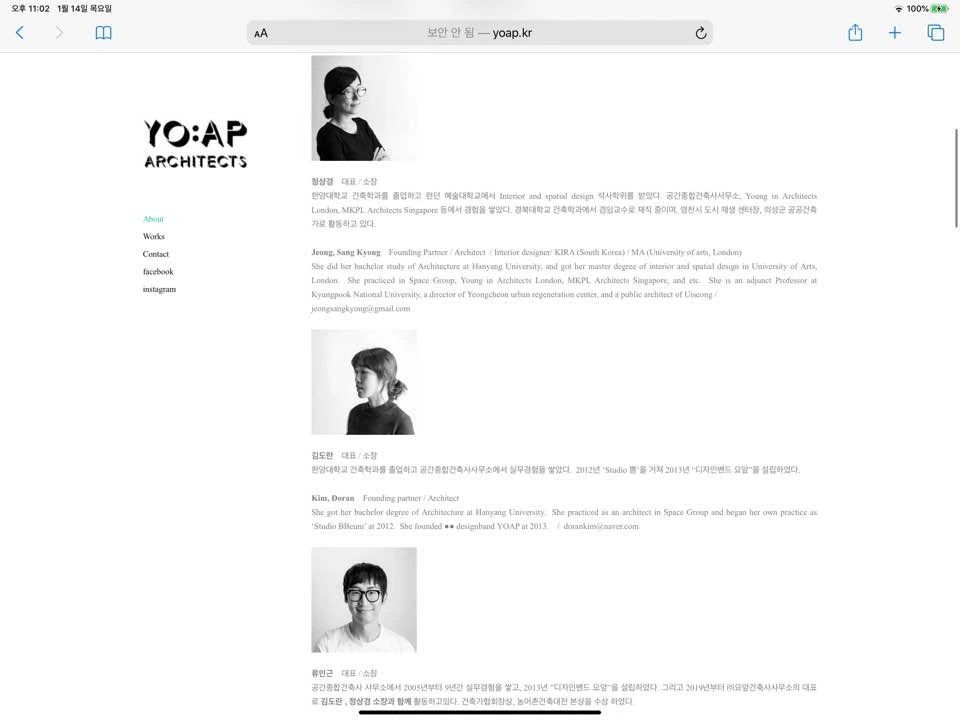 about에는 요앞건축사사무소가 지향하는 점을 적어놓았다. ‘우리는 작업을 진행하는 과정에서 지속가능한 즐거움을 추구하고 공유하기를 바라며’ 라는 문장은 사무소에 대한 궁금증을 자극했다. 일을 하면서 즐거움을 계속 느끼기란 정말 어렵다고 생각한다. 어쩌면 판타지에 가깝다고 생각한다. 그런데 그 즐거움을 추구하고 공유하는 것을 지향하는 사무소는 어떤 분위기일지 궁금했다. 아래에는 소장님 세분의 이력을 적어놓았다. 그런데 내용이 일단락 된 줄 알았는데 소장님이 한분 더 계셨다. 요앞 파리 대표님이라고 한다. 한국과 파리에서 작업을 이어가는 사무소라서 그 지역별 차이가 궁금했다. 아래의 yoap.fr 프랑스 주소로 접속하니 결국 yoap.kr로 돌아와서 호기심에 닿지 못해 아쉬움이 남았다. 그리고 오랜만에 일한 직원들, 인턴들의 이름을 게재하는 웹사이트였다.
