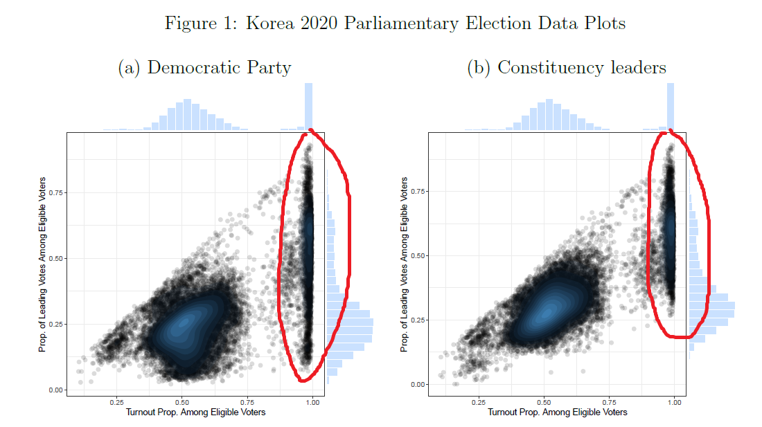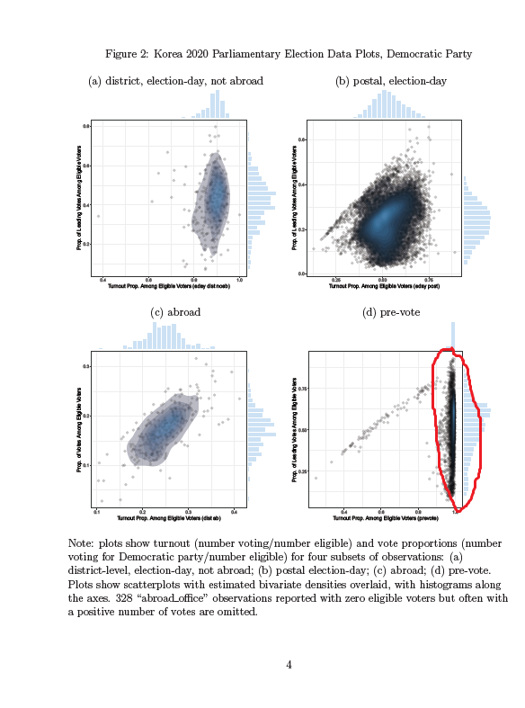3. 다음으로, 박원호 교수님이 지적하신 미베인 교수의 데이터의 문제점을 다시 한 번 살펴보자. 위 1페이지를 보면 투표율(turnout proportion)과 득표율(vote proportion)을 계산할때는 Number Eligible, 유효한 투표수를 분모로 사용했다고 본인이 설명한다. 이건 사실 선거집계자료로 연구할때 투표율, 득표율 계산할때 너무 기본적인 부분이라 굳이 언급할 필요도 없지만 굳이 언급하는 이유가 있다. 아래의 Figure 1을 보면 빨간 색으로 칠해진 구역에 이상한 패턴이 발견된다. 투표율이 100%에 가까운 구역에 엄청나게 많은 수의 observation이 몰려있는 것을 알 수 있다. 이 부분이 바로 박원호 교수님께서 지적하신 데이터 상의 문제점이다. Figure 2를 보면 이런 패턴이 주로 Prevote, 즉 사전투표에서 확인된다는 것을 알 수 있다.