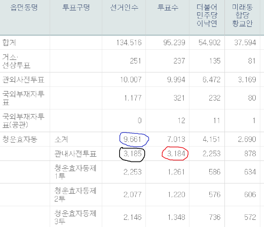 4. 선관위 홈피를 가서 선거자료 집계 현황을 살펴보면 아래와 같다. 보다시피 '관내사전투표' 선거인수와 투표수가 거의 같다. 이 부분도 박원호 교수님이 지적하신 부분인데.. 우리나라는 사전투표에 있어서 사전등록이 필요없기 때문에 사전투표를 한 유권자 수가 곧 사전투표 총 선거인수로 집계되고 있다. 그럼 무효표, 기권표를 제외하면 당연히 관내사전투표의 투표율은 저대로 계산을 하면 100% 가깝게 나올 수 밖에 없다. 그리고 미베인 교수가 범한 실수가 이거다. 관내사전투표 선거인수는 미베인 교수가 말한 Number of Eligible이 아니다. 진짜 Number of Eligible은 해당 동 내의 총 선거인수, 파란색 동그라미에 속한 수치다. 말하자면, 미베인 교수는 3,184(빨간색)/3,185(검은색)을 통해 투표율을 99.9%로 계산했지만 실제 사전선거 투표율은 3,184(빨간색)/9,661(파란색)=33.0% 라는거다. 명백한 오류다. 미베인 교수는 이거를 Prevote indicator 더미변수를 모델에 추가해서 통제했으니 문제가 없다고 했는데 말도 안되는 소리다. 오염된 데이터가 있으면 빼거나 다시 계산하는게 상식적인 반응이지, 더미변수 있다고 문제없다고 하는건 대체 뭔 소린지 모르겠다. 저널에 투고한 논문에서 이런 오류가 발견되었고 저렇게 답변을 했다면 100% 리젝 먹을거다.