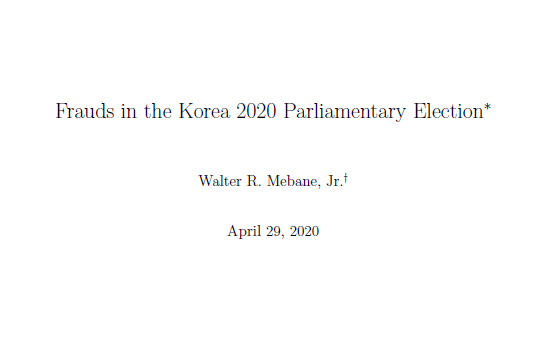 1. 먼저, 아래의 그림이 바로 논란이 되고 있는 미베인 교수의 논문(정확히는 워킹페이퍼)의 제목이다. 'Frauds'라는 단어가 학계 내에서 사용되는 의미와 통념적으로 사용되는 의미가 다소 다를 수 있고, 본문에서도 미베인 교수가 명시하듯.. 본인의 분석결과는 '분석모형 내에서의' Fraud가 감지된 것이며 이것이 실제 Fraud를 의미하는건 아니라고 했어도 제목 자체가 매.우. 자극적이다. 정말 한 치의 오차도 없는 분석이어도 이런식으로 확정적으로 어느 국가의 선거가 Fraud라고 대놓고 말하는 페이퍼 제목은 잘 뽑지 않는다. 아무리 정교한 모델이라도 사회과학에서 사용하는 계량적 방법이란게 외적 타당성(external validity) 측면에서 태생적으로 한계가 있어서 그렇다. 아무튼.. 그래도 내적 타당성(internal validity)이 확실하다면 학자의 재량에 따라 이런 도발적인 제목도 뽑을 수는 있다고 생각한다. 그런데 내적 타당성이 있는가? 가 문제가 되는거다.