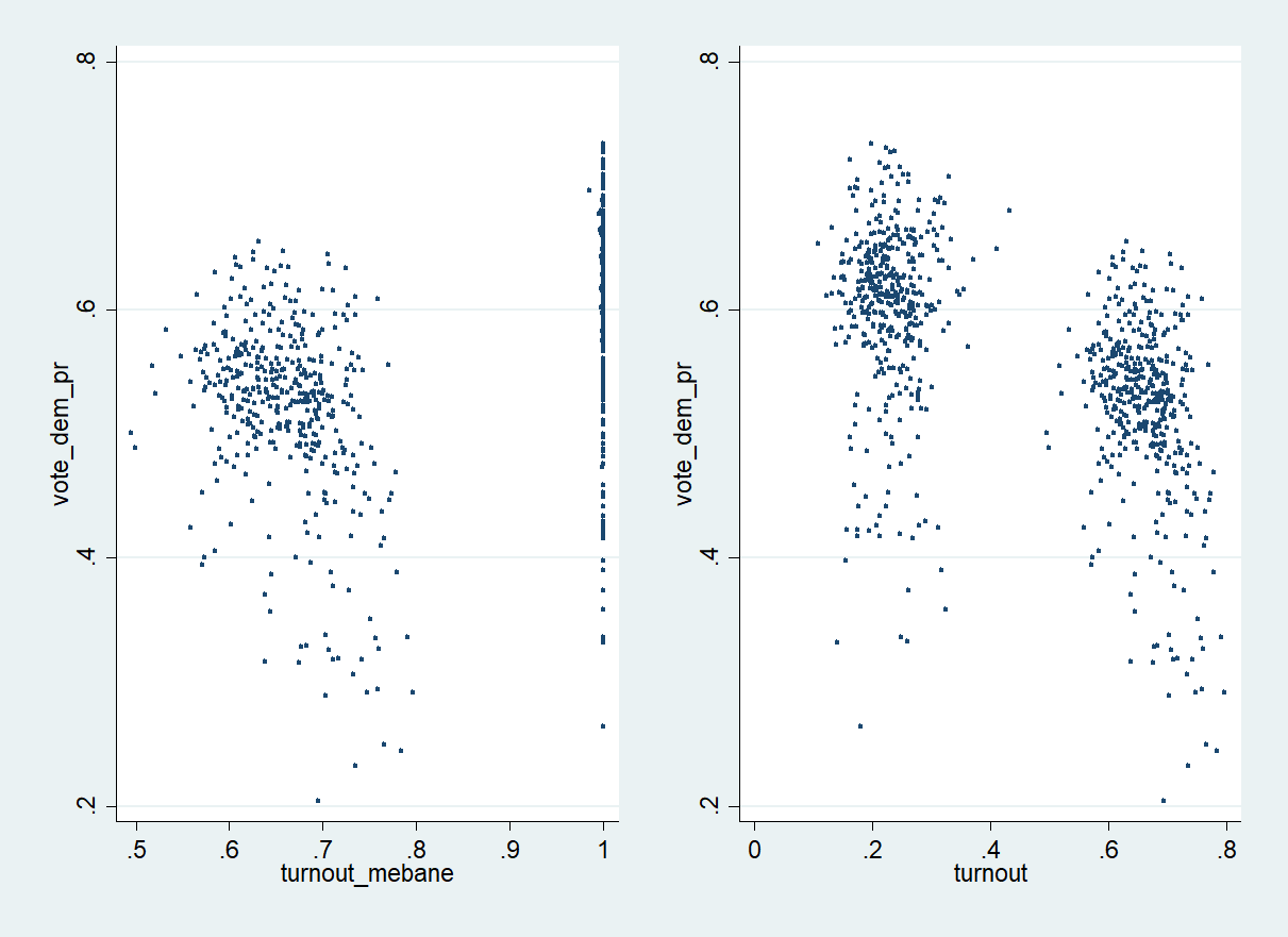 6. 뭐 이렇게 보여줘도 선거부정론을 믿고 싶은 이들은 미베인 교수의 분석결과가 달라지지 않을 것이라거나, 듣보잡이 뭘 안다고 지적하냐 미베인 교수가 대가인데 넌 뭐냐 등등 반응을 보이겠으나 그래도 답답해서 한 번 써본다. 그래도 한 가지 확실한 사실은 미베인 교수가 사용한 데이터에 문제점이 있다는 거고, 그건 미베인 교수의 명백한 실수로 인해 발생한 문제라는 거다. 사회과학 논문에서 사용되는 데이터 중 100% 오염되지 않은 데이터가 어디있겠냐만 이 정도는 용인 가능한 범위를 한참 넘어서는 것이다.