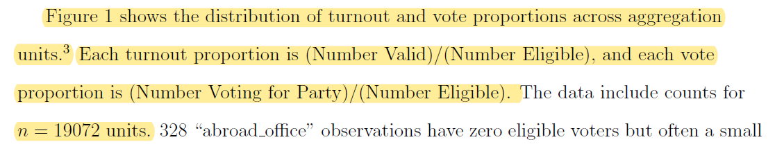 2. 자, 일단 미베인 교수의 워킹페이퍼 본문 1페이지 내용 중 일부이다. 일단 분석단위에 대한 정확한 명시가 없긴 한데 각주를 보면 읍면동(Eupmyeon-dong) 단위를 언급했는데 한 가지 눈에 띄는게 이 양반이 선관위 데이터를 구글 번역기를 돌려서 식별을 했다는 것이다. 뭐 주변에 한국학자 아는 사람이 없어서 그렇다치자. (근데 처음 분석을 의뢰한 사람이 일본대학 소속의 한국인 학자인데 왜 이 사람에게 물어보지 않았을까? 하는 궁금증은 남는다.) 다만 컨텍스트에 대한 이해가 기반이 되지 않은 데이터 분석의 서막처럼 느껴진달까..
