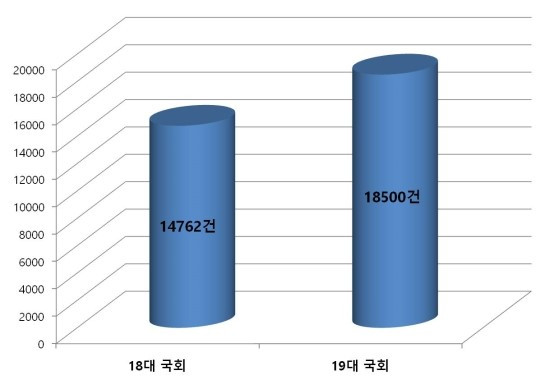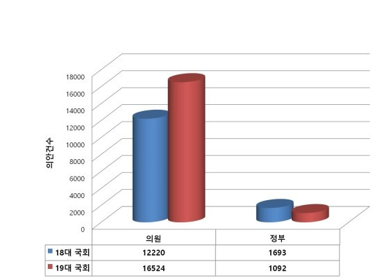 여기에서는 국회 의안정보시스템에서의 의안통계를 활용하여 제18, 19대 국회의 입법생산성을 비교해볼 것입니다. 먼저, 제18대 국회와 제19대 국회(2016년 1월 8일까지)에서 발의된 의안의 건수를 살펴보도록 하겠습니다.