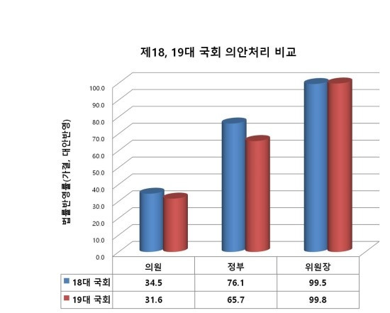 한국의 대통령제의 가장 큰 특징은 정부(행정부)도 의회에 직접 의안을 발의할 수 있다는 것인데, 발의주체별로 의안건수를 살펴보면 국회의원들은 18대 국회에 비해 19대 국회에서 더 많은 의안을 발의하였습니다. 반면, 정부가 발의한 의안건수는 18대 국회보다 19대 국회에서 더 적은 것으로 나타났습니다. 그러나 <그림 1>과 <그림 2>는 단순히 발의된 의안건수를 살펴본 것이기 때문에 실제로 이 의안들이 얼마나 법률에 반영됐는지를 보여주지는 않습니다. 의안의 법률반영률(원안가결, 수정가결, 대안반영폐기 포함)은 아래 <그림 3>에서 확인할 수 있습니다.