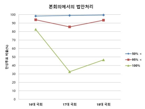 보다시피, 16-18대 국회 본회의에 상정된 대부분의 법안은 과반수 이상의 찬성으로 통과되었으며 이 중 상당수는 95% 이상의 찬성으로 통과되었습니다. 이는 국회 본회의 투표에서는 의원의 자율성이 매우 낮고 많은 경우 교섭단체 간의 합의에 의해 법안이 처리된다는 현실을 보여주는 것입니다. <그림 1>의 결과는 메이휴의 주장과는 달리 한국 국회에서는 의원들이 기명투표를 통해 정책입장 표명을 하지 못할 수도 있음을 보여주고 있습니다. 그럼에도 불구하고 <그림 1>은 16대 국회 이후 100% 합의처리 되는 법안의 비율이 급격히 줄어들고 많은 경우 교섭단체 간의 합의로부터 이탈하는 투표를 하는 의원들이 있다는 것을 보여주고 있습니다.