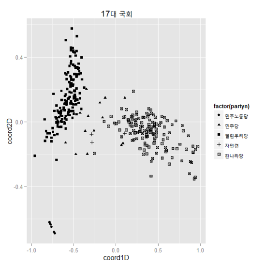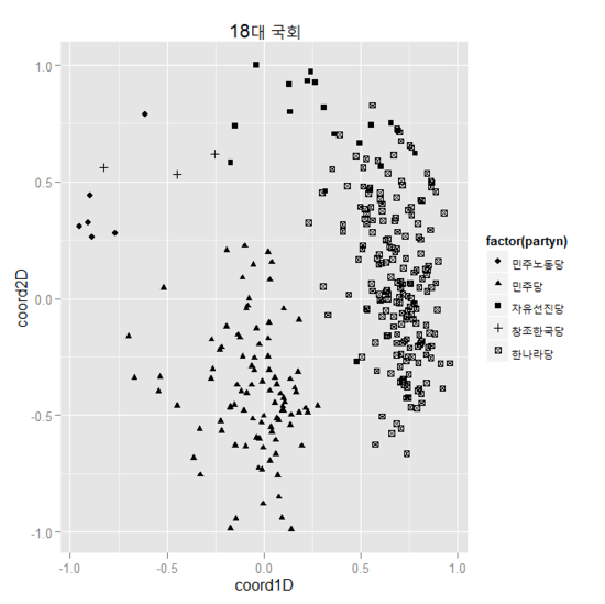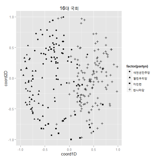 그렇다면, 한국 국회에서도 의원들이 기명투표를 통해 정책입장 표명을 하고 있는지 여부는 어떻게 알 수 있을까요? 여기에서는 풀과 로젠탈(Poole and Rosenthal, 1997)이 개발한 NOMINATE(Nominal Three-Step Estimation)라는 방법을 활용하여 한국 국회에서 의원들이 기명투표를 통해 정책입장을 표명하는지 여부를 살펴볼 것입니다. NOMINATE는 주어진 의원의 기명투표 자료를 통해 해당 의원의 최적점(ideal point)을 도출해내는 기법입니다(NOMINATE 방법에 대한 자세한 논의는 Poole and Rosenthal, 1997; Poole, 2009 등을 참조하기 바랍니다). 이는 의회를 2차원의 공간으로 가정하고 이 안에서 개별 의원들의 정책적 위치를 찾아내는 것입니다. 아래의 <그림 2>부터 <그림 4>는 한국 국회에서의 기명투표에 대한 NOMINATE 분석을 시각화한 것입니다.