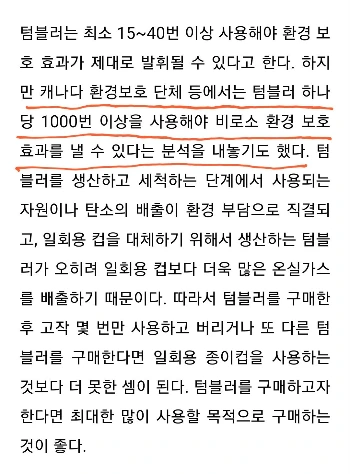 하지만 텀블러 사용이 항상 환경보호에 도움이 되는 것은 아니다. 몇 번 쓰지도 않고 새것을 자주 산다면 의미가 없다. 캐나다 환경보호 단체 등에 의하면 1000번 이상 텀블러를 사용해야 환경보호 효과가 있다고 한다. 하루에 한 번 사용한다고 치면 적어도 3년 이상은 사용해야 하는 셈이다.